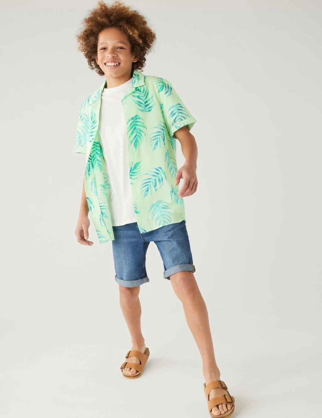 Crafted from a lightweight cotton-modal blend, this two-piece set is the stuff tropical dreams are made of. Comfy regular fit. Includes a leaf print shirt with breezy short sleeves and a plain t-shirt.