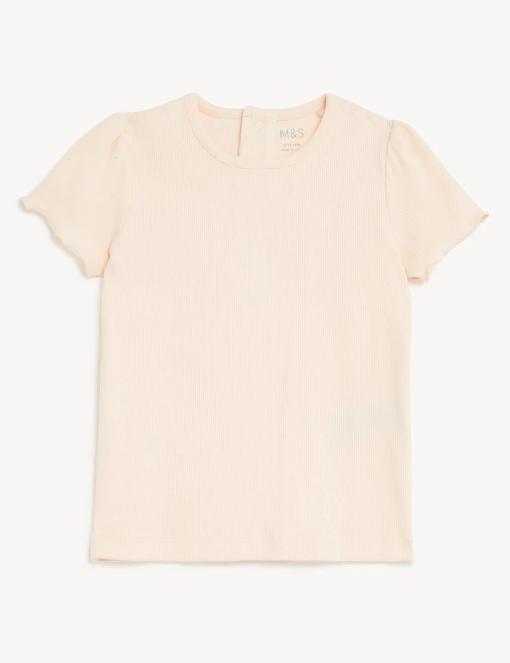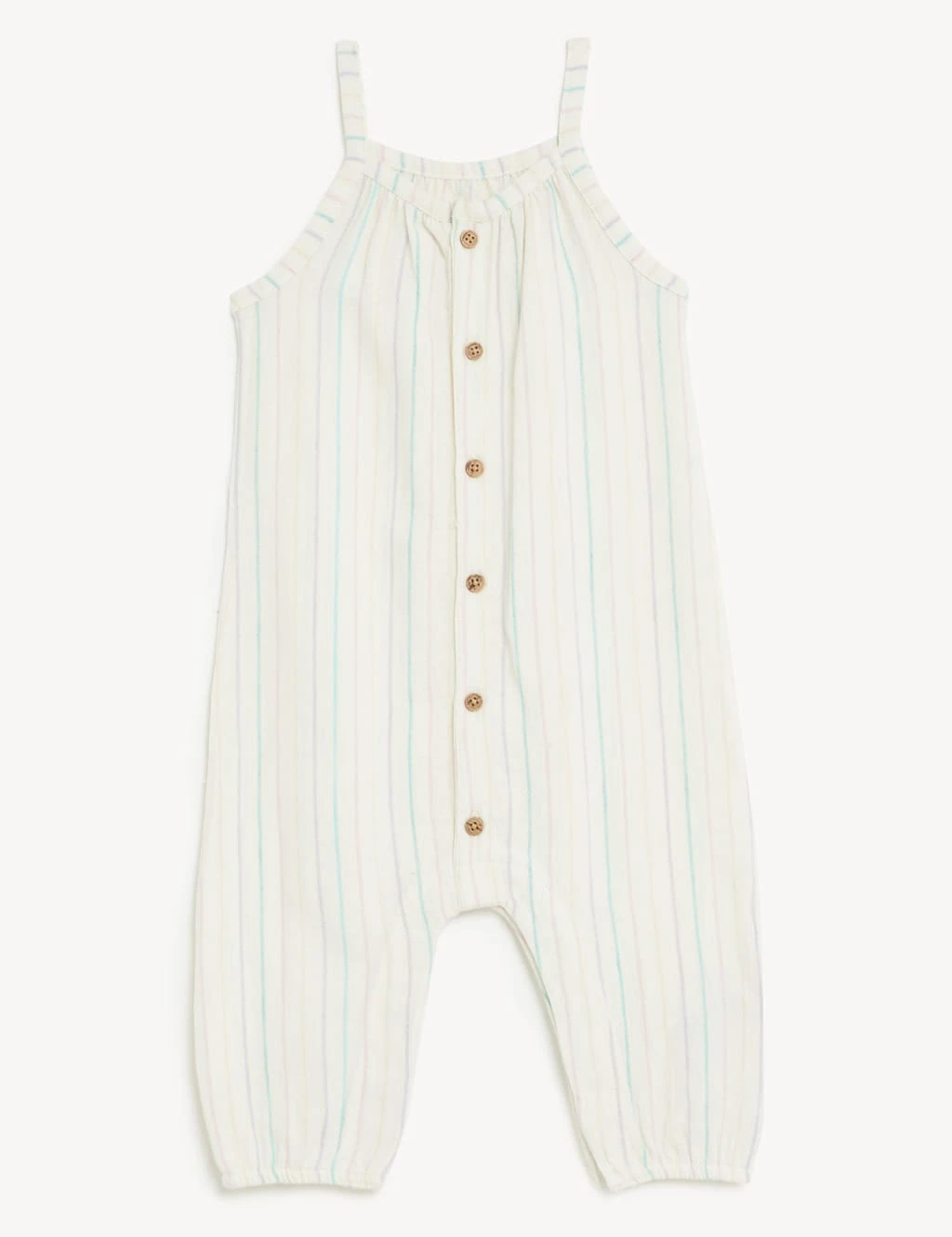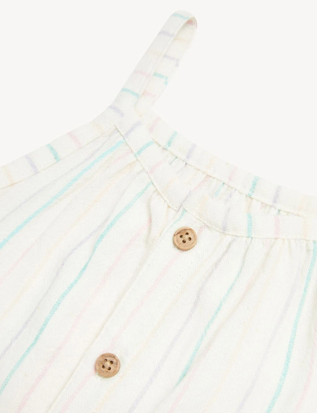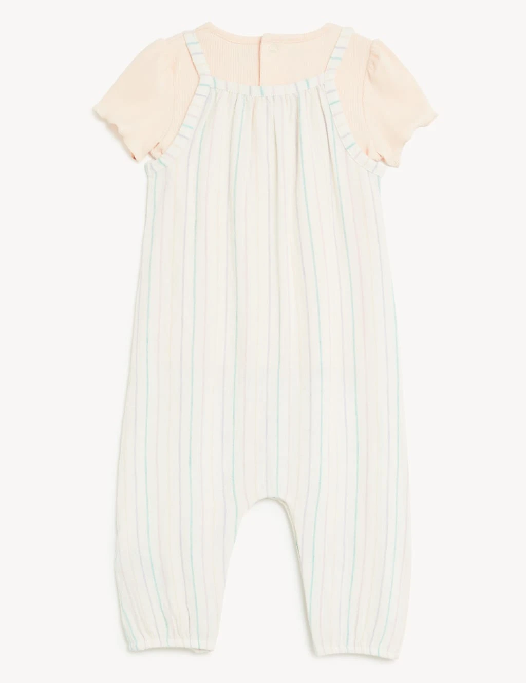 Get them ready for warm weather with this breezy cotton-rich outfit. Features a striped, strappy romper suit with a button-through fastening, elasticated ankles and poppers at the gusset for easy changing. Paired with a ribbed t-shirt sporting pretty ruffled sleeves.