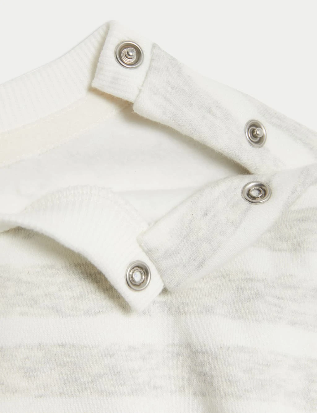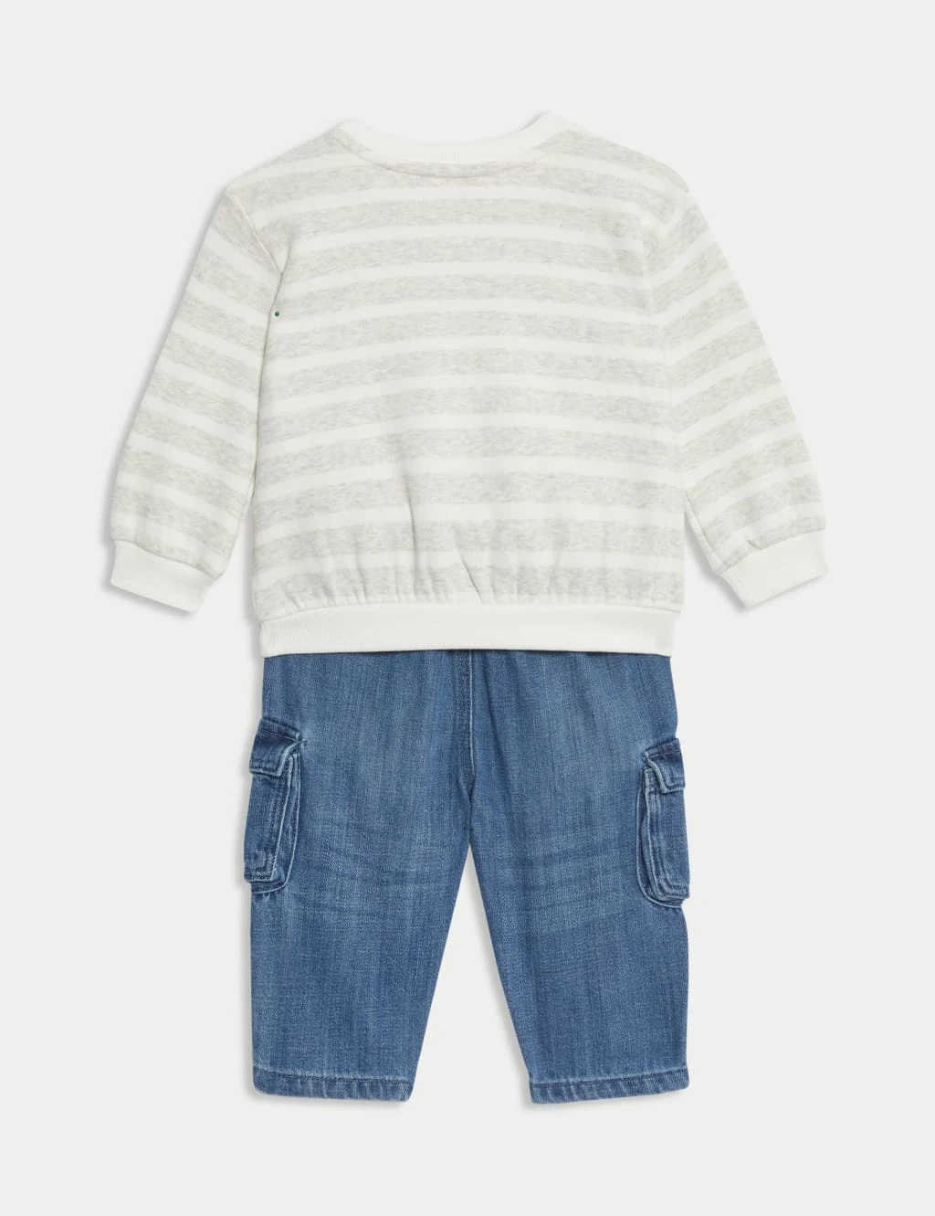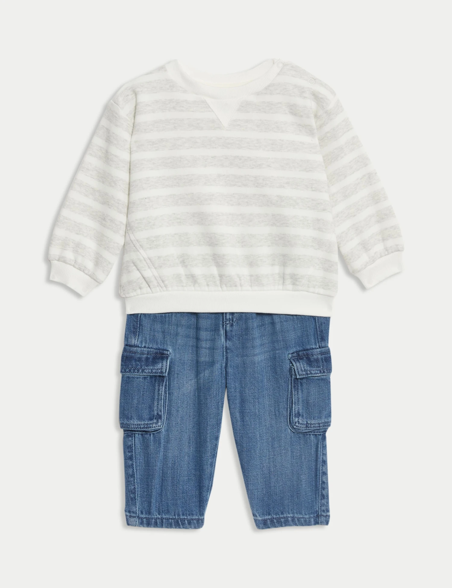 This cotton-rich outfit is a perfect casualwear choice for your youngster. The two-piece set includes a striped sweatshirt with classic ribbed trims. On ages up to 2-3 years, poppers on the shoulder make dressing easier. Elasticated waist jeans with cargo pockets complete the look.