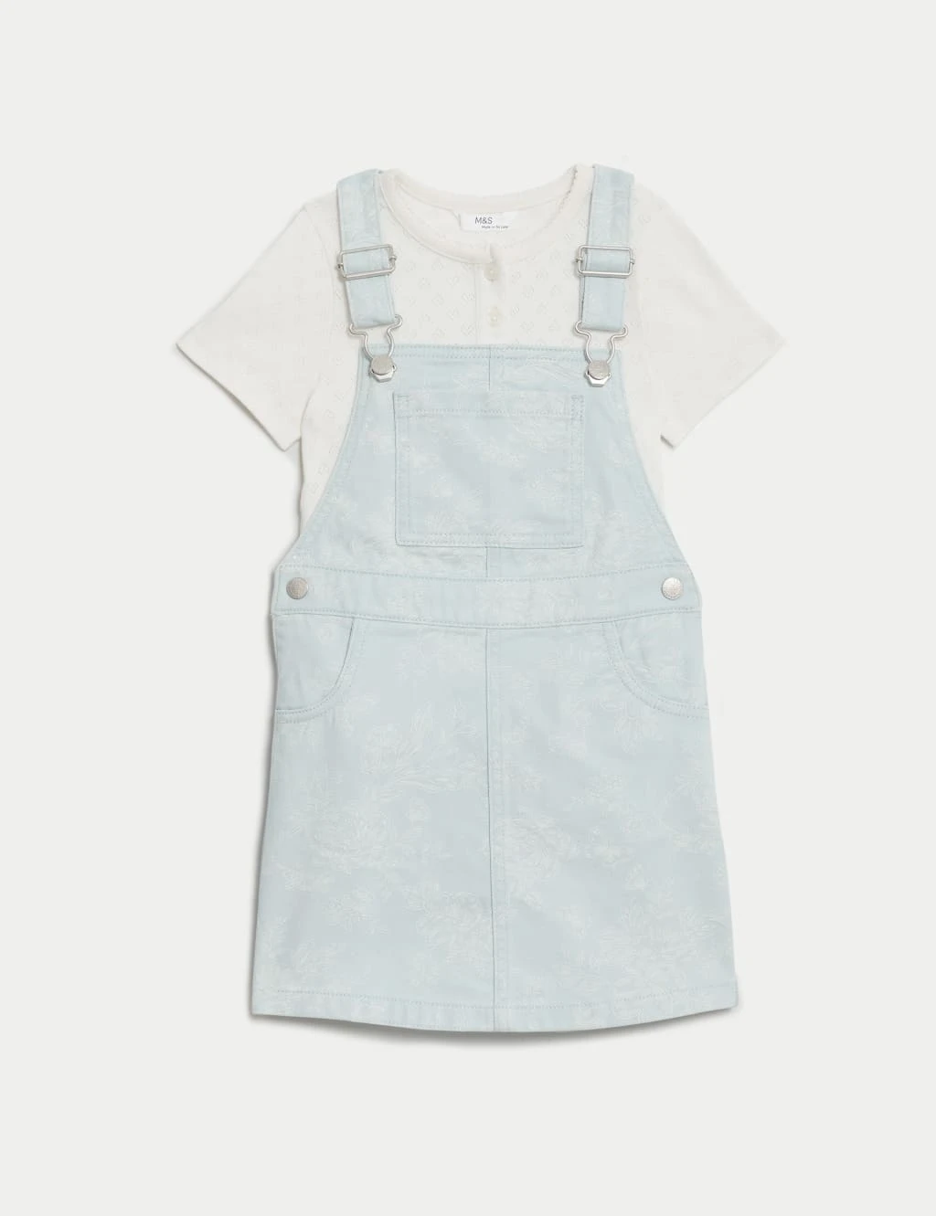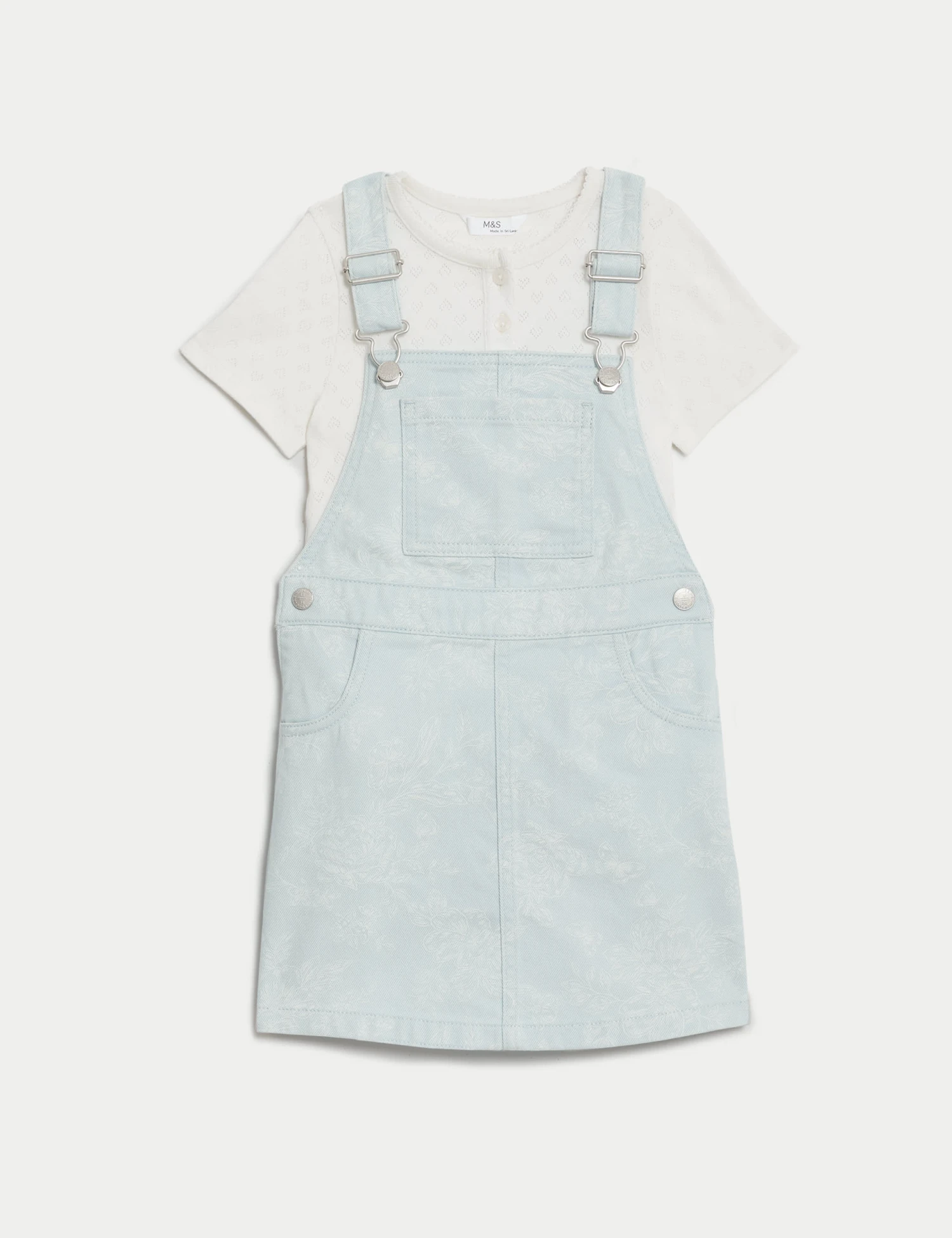 This pure cotton pinafore and top set is the perfect choice for their weekend wardrobe. Comfy regular fit. The denim pinafore features a pretty frill hem and two handy patch pockets on the front. Adjustable button fastenings on the straps mean they can wear it as they grow. The short-sleeved top features a button fastening, with a pretty frill at the neck and cute pointelle heart pattern in the fabric.