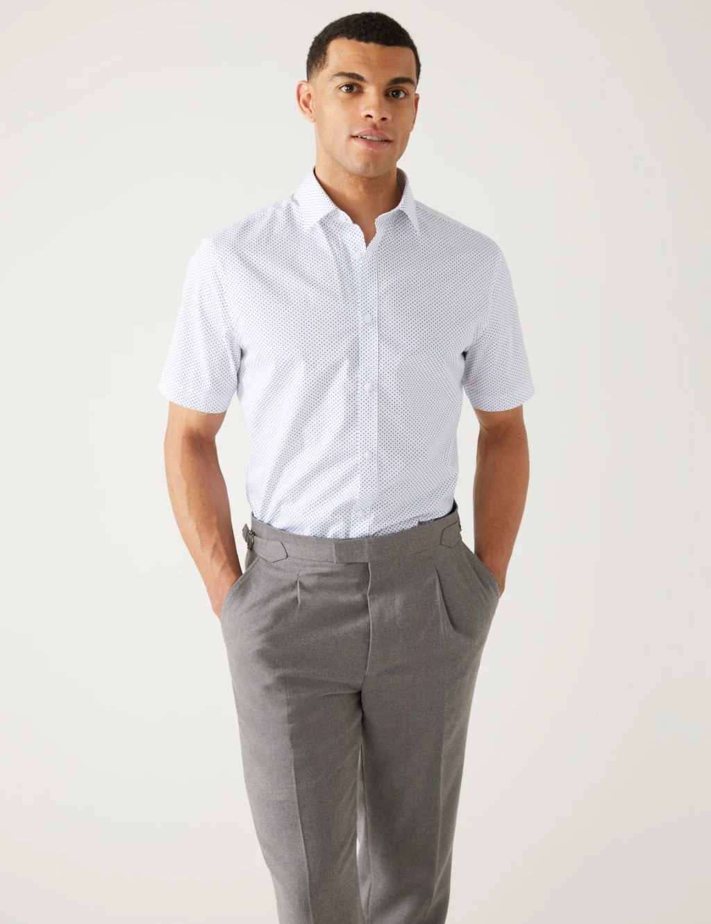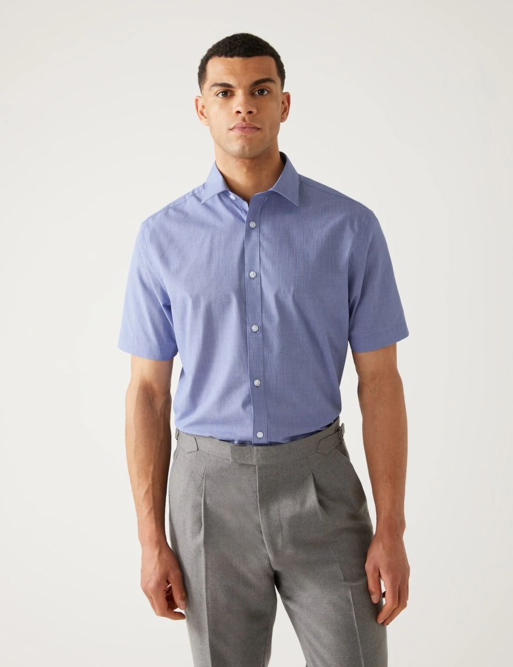 These short-sleeved shirts are made from a crisp cotton-blend fabric that lets your skin breathe. Comfy regular fit, with a classic collar. Pack has one semi-plain shirt and one with a subtle geometric pattern. Our easy-iron finish makes your new shirts simple to care for.