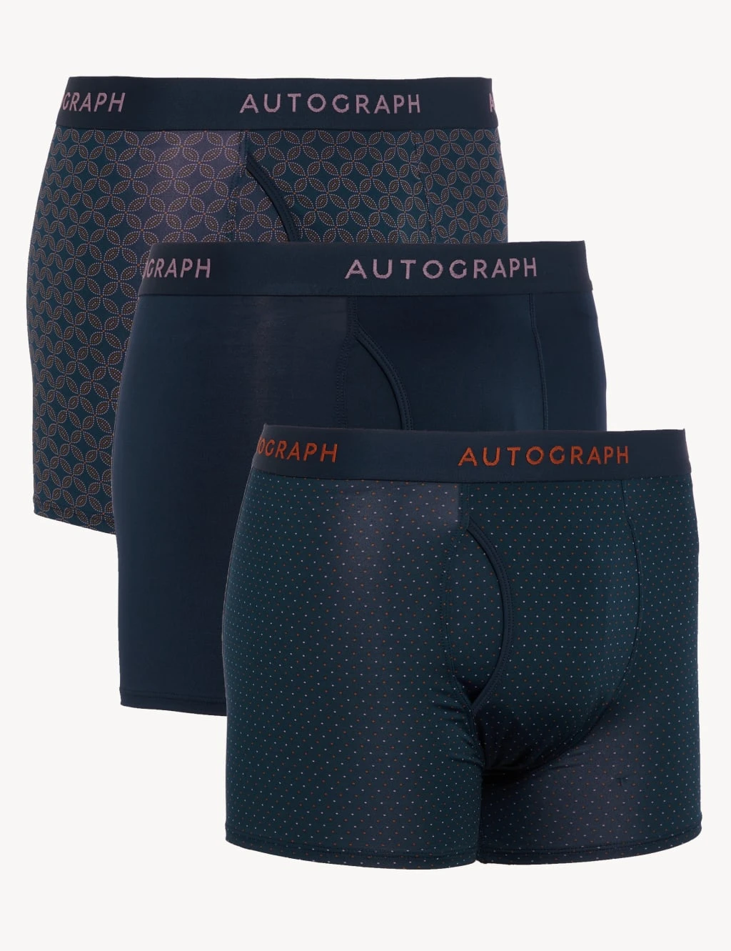 Refresh your underwear drawer with these trunks from our Autograph collection. They’re made in a comfortable regular fit with flexible added stretch. This three-pack gives you a choice of two lively patterns and one plain design. Branding on the waistbands adds a statement finishing touch.