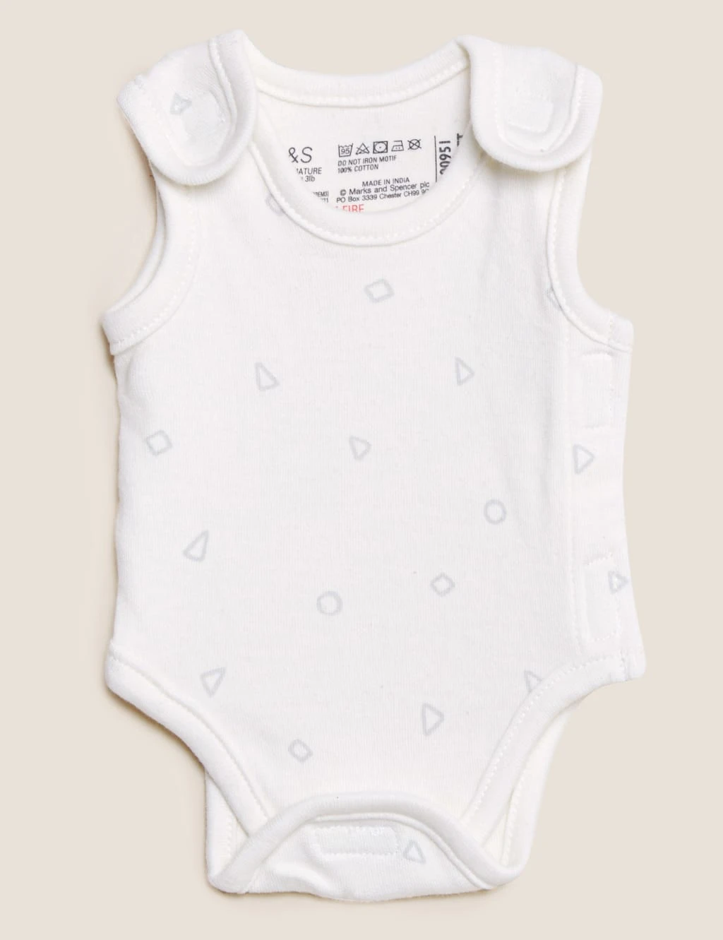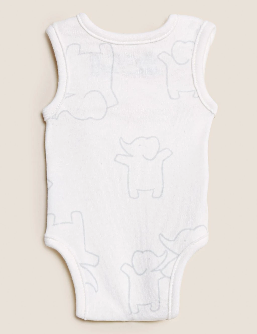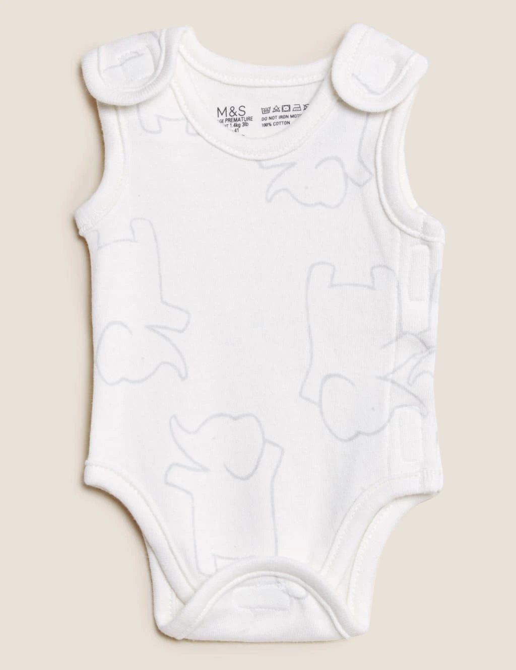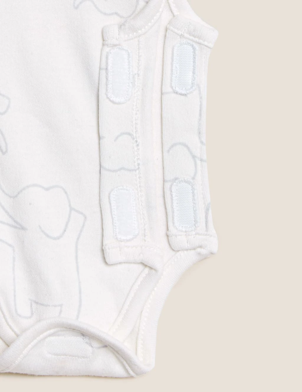 Keep baby comfortable in these sweet bodysuits, made from soft, pure cotton. They’re made in premature sizing for up to 3lbs and 4lbs, with flat seams and printed labels to protect delicate skin. The velcro openings fold out flat for easy dressing. Pack of three features stripes, elephants and shape prints. We only ever use responsibly sourced cotton for our clothes.