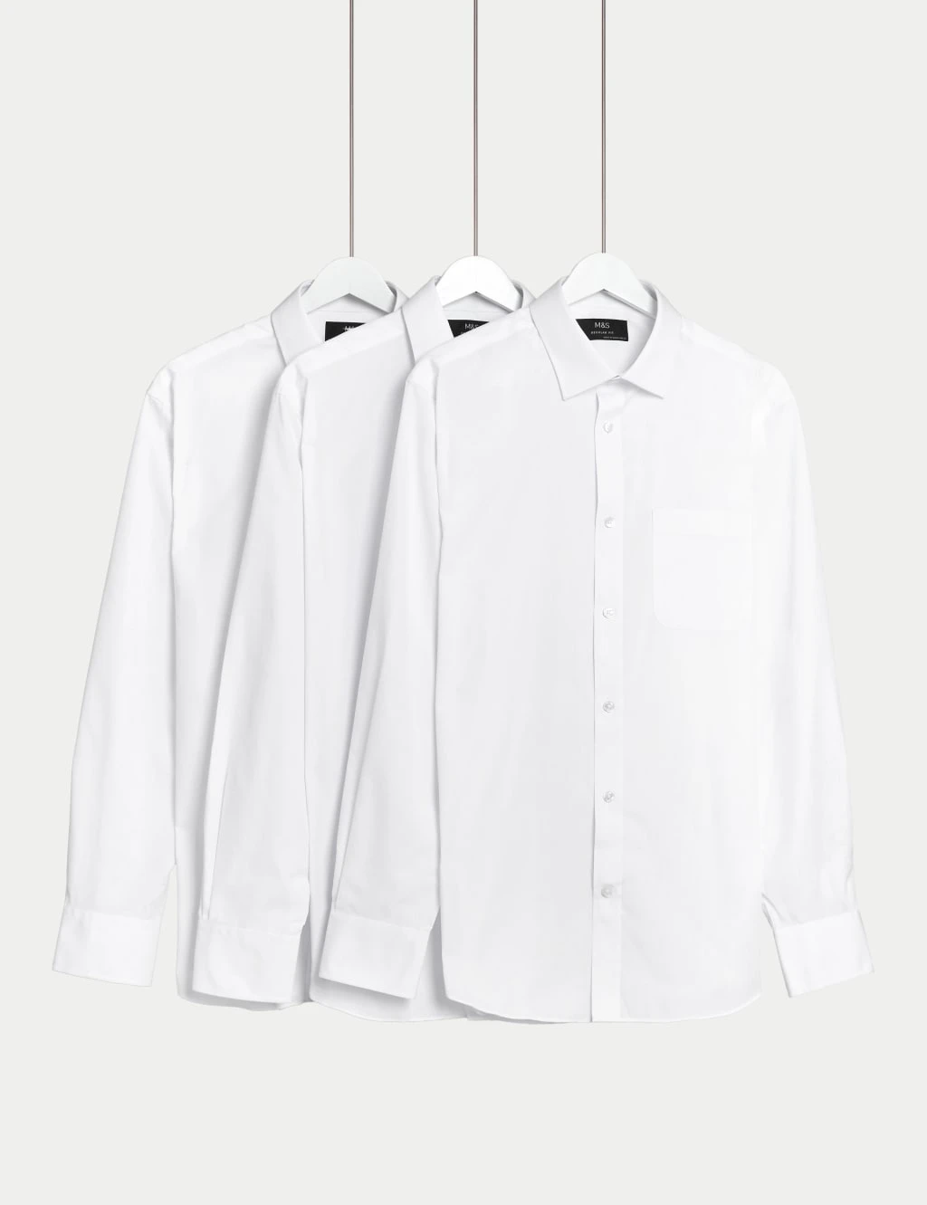 This pack of three smart shirts is the perfect foundation for your formalwear wardrobe. Cut from lightweight, crisp poplin to a classic regular fit. Easy-to-iron technology means they’re easy to care for. We only ever use responsibly sourced cotton for our clothes.