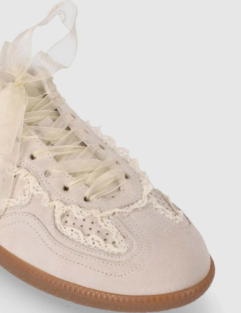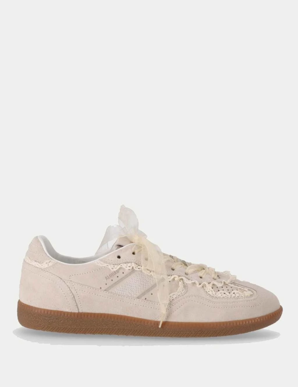 The Alohas Tb.490 trainers put a feminine spin on streetwear. Soft suede fabric shapes a classic low-top silhouette, grounded by resilient rubber soles. Intricate openwork panels appear, with lace trims and gauzy ribbon laces lending a touch of elegance.