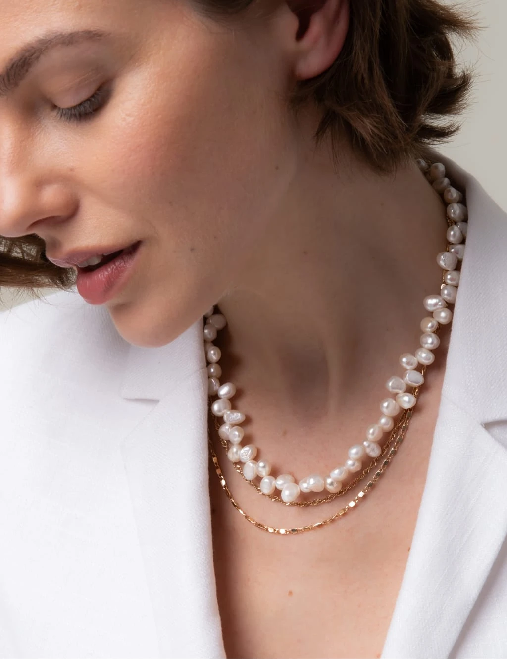 This Autograph Fresh water pearl necklace is layered upon a sleek 2 row fine gold chains. This style is made with recycled materials