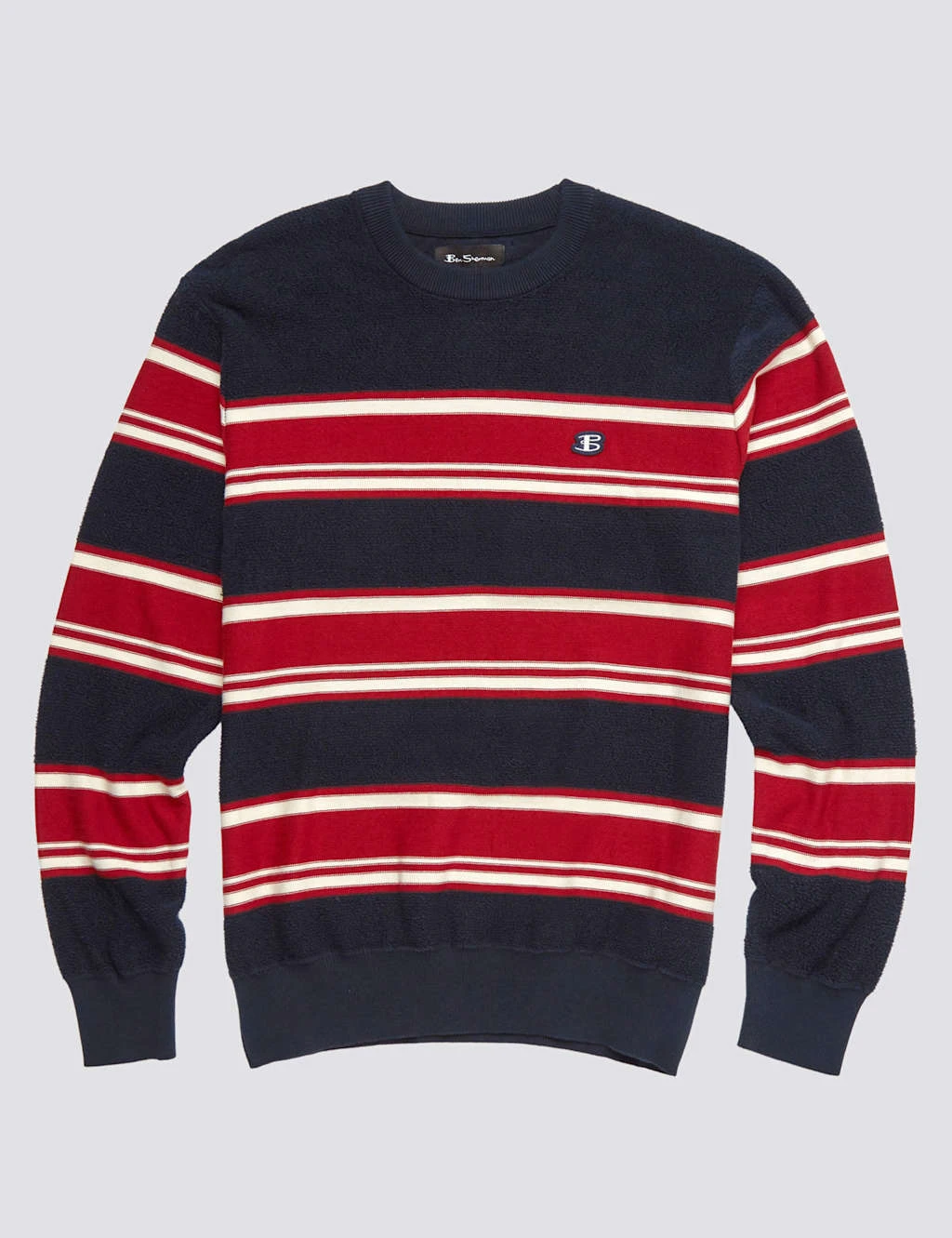 This Ben Sherman jumper is knitted from pure cotton yarn for a cosy feel. Its crew-neck style is ideal for layering up, while ribbed trims at the cuffs and waistband help lock in warmth. The heavyweight knit is complemented by inset towelling textured panels that give this piece a substantial finish. Bold horizontal stripes ensure a standout look and an embroidered ‘B’ on the chest lends a discreet touch of branding.