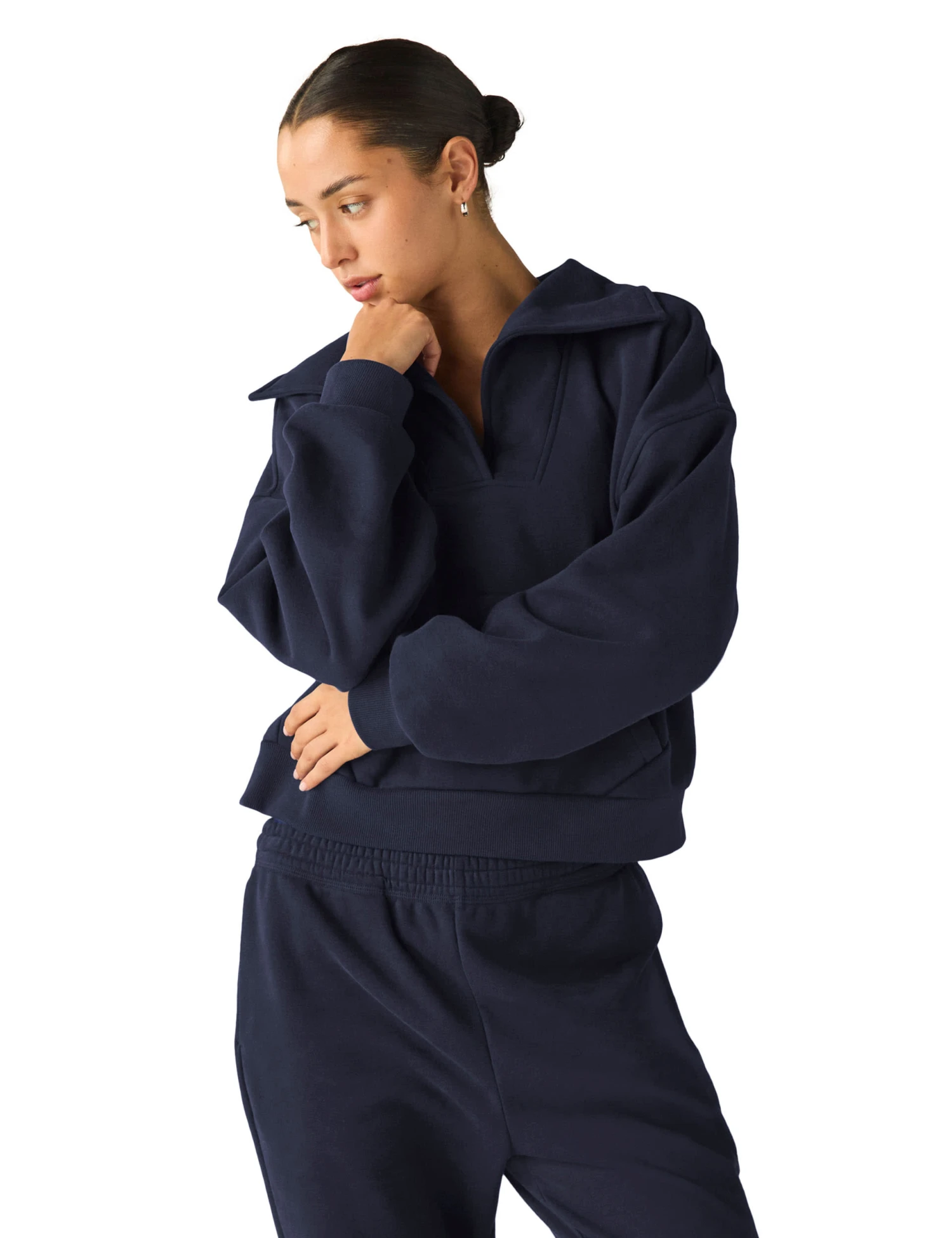 A laidback, sporty look is easy with this cotton-rich sweatshirt from Beyond Yoga. It’s made in an effortless relaxed fit to a boxy silhouette, with a flattering v-neck placket and a wide collar for a stylish touch. A kangaroo pocket at the front adds a practical finishing touch.
