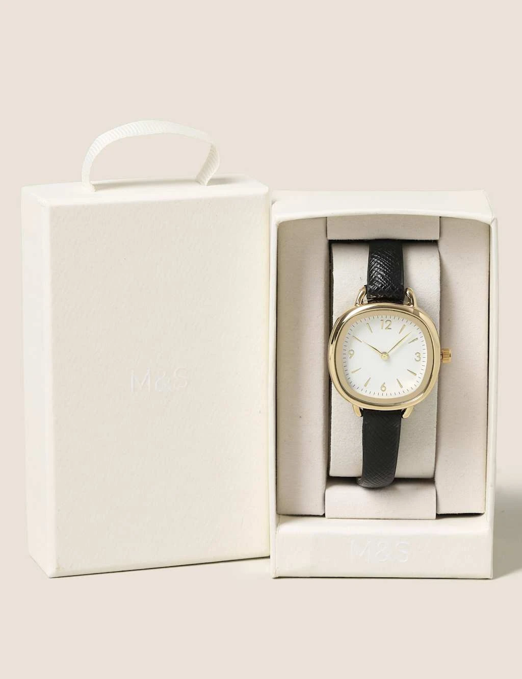 This Classic Black Croc Print faux Leather strap with light gold tone metal surround and a white gloss face.