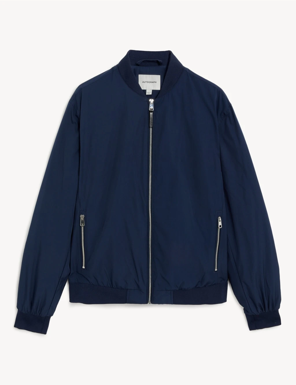 Style and practicality go hand in hand with this bomber jacket from our Autograph range. Designed in a regular fit, it features the classic baseball neckline and ribbed trims. A soft jersey lining ensures it feels comfortable and water-repellent Stormwear™ technology to keep you dry in a shower. Silver-toned zips on the front and side pockets complete the contemporary look.