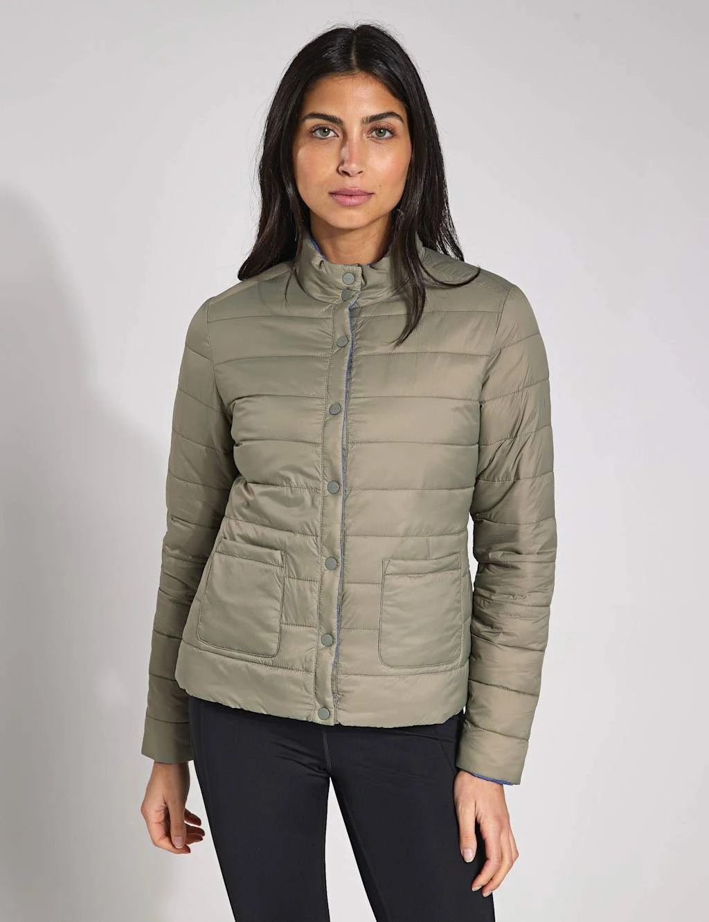 The lightweight Lyra puffer jacket from BORN has a reversible design for two ways to wear. This quilted style is made in a regular fit from wind-repellent fabric with thermal insulation. A funnel neck offers extra coverage. Both sides feature popper fastenings and handy patch pockets.