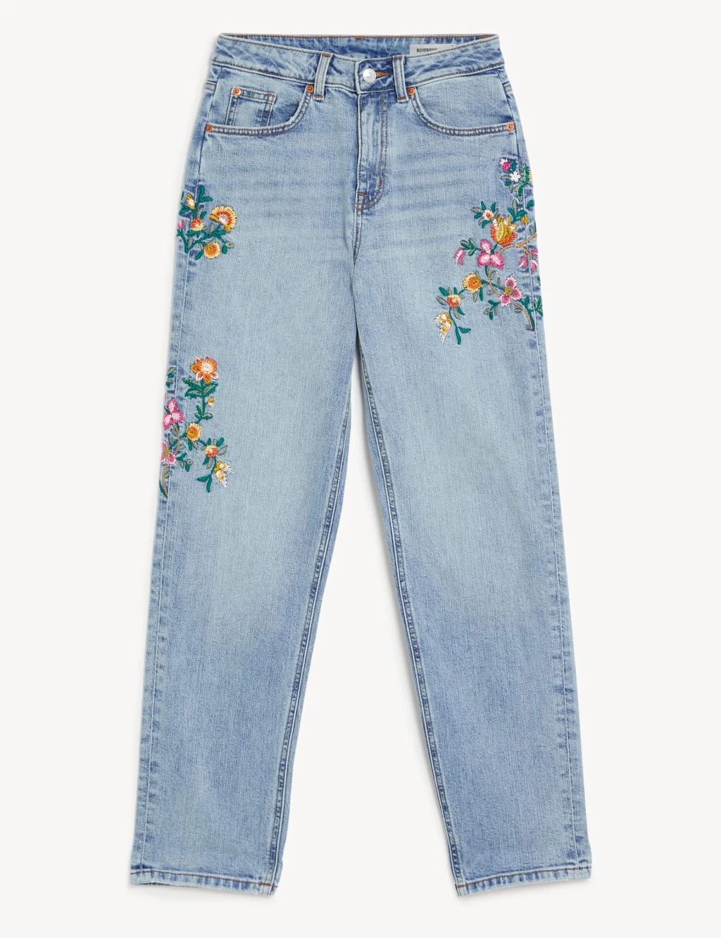 These embroidered jeans will be the star of your casual wardrobe. They’re cut to our popular boyfriend fit, with a looser style through the legs and a contemporary ankle grazer length. The mid-rise waist is secured with a zip and button fastening for easy wear. Added stretch in the authentic washed denim adds extra comfort.