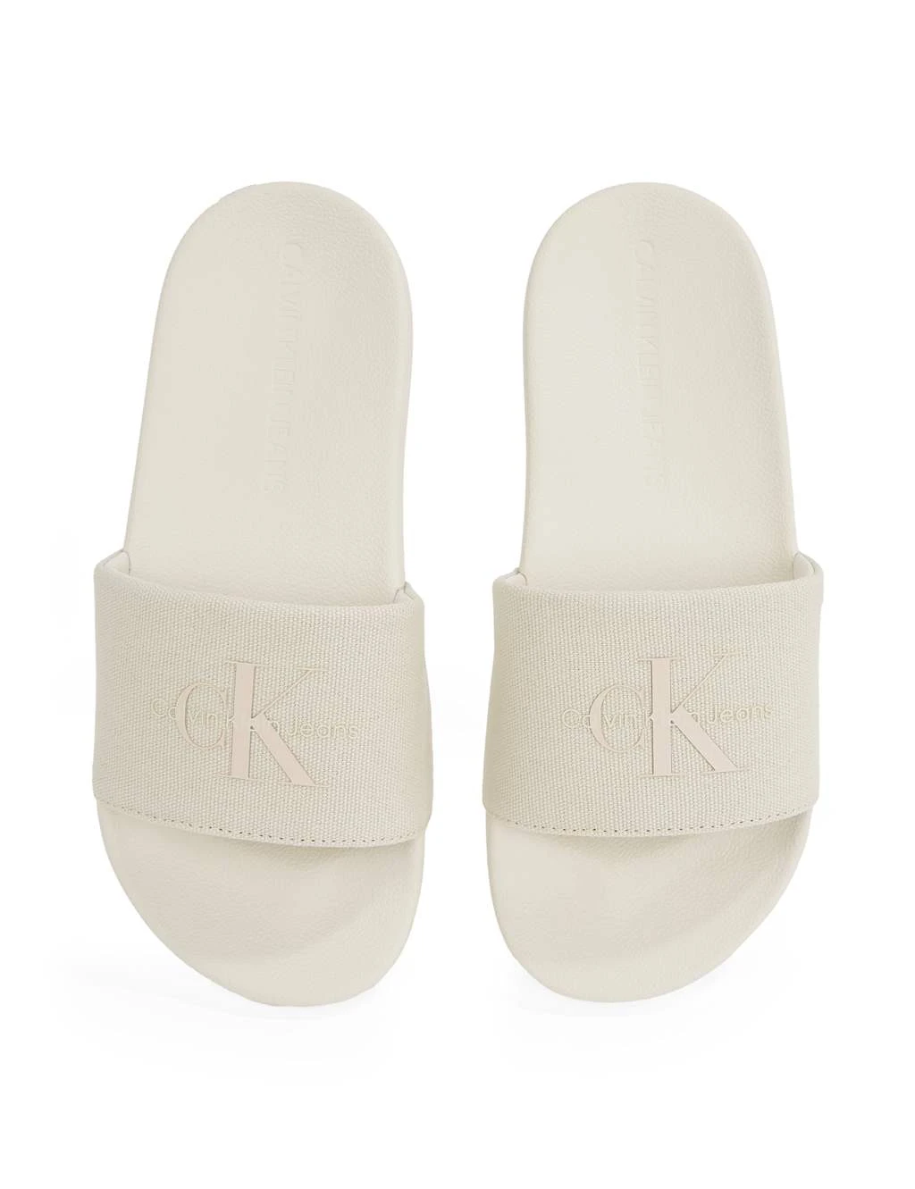 These Calvin Klein sliders are a stylish choice for warm weekends and holidays. The easy slip-on design features a wide textile strap across the toe, stamped with a tonal monogram for signature appeal. A gentle texture to the comfortably contoured footbed helps to keep your foot from slipping.