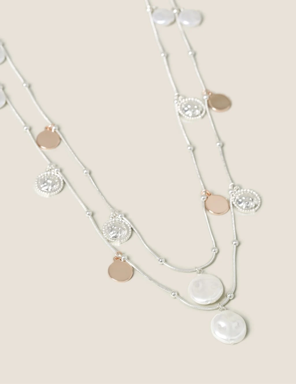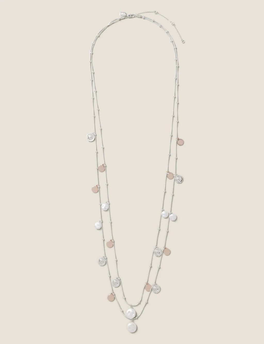 This sleek multirow necklace combines charms and pearl to create the perfect day to night necklace.