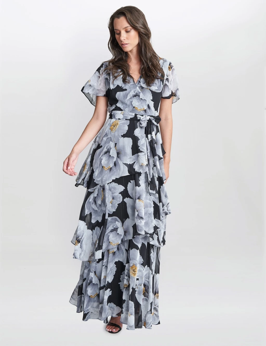 Make an entrance with this eye-catching chiffon dress from Gina Bacconi. The flattering wrap style has a regular fit, with a v-neck and a self-tie belt to nip you in at the waist. Ruffled tiers create a lovely shape while the statement floral print adds feminine appeal. This piece is designed with short angel sleeves and a floor-sweeping maxi hem for a sophisticated finish.