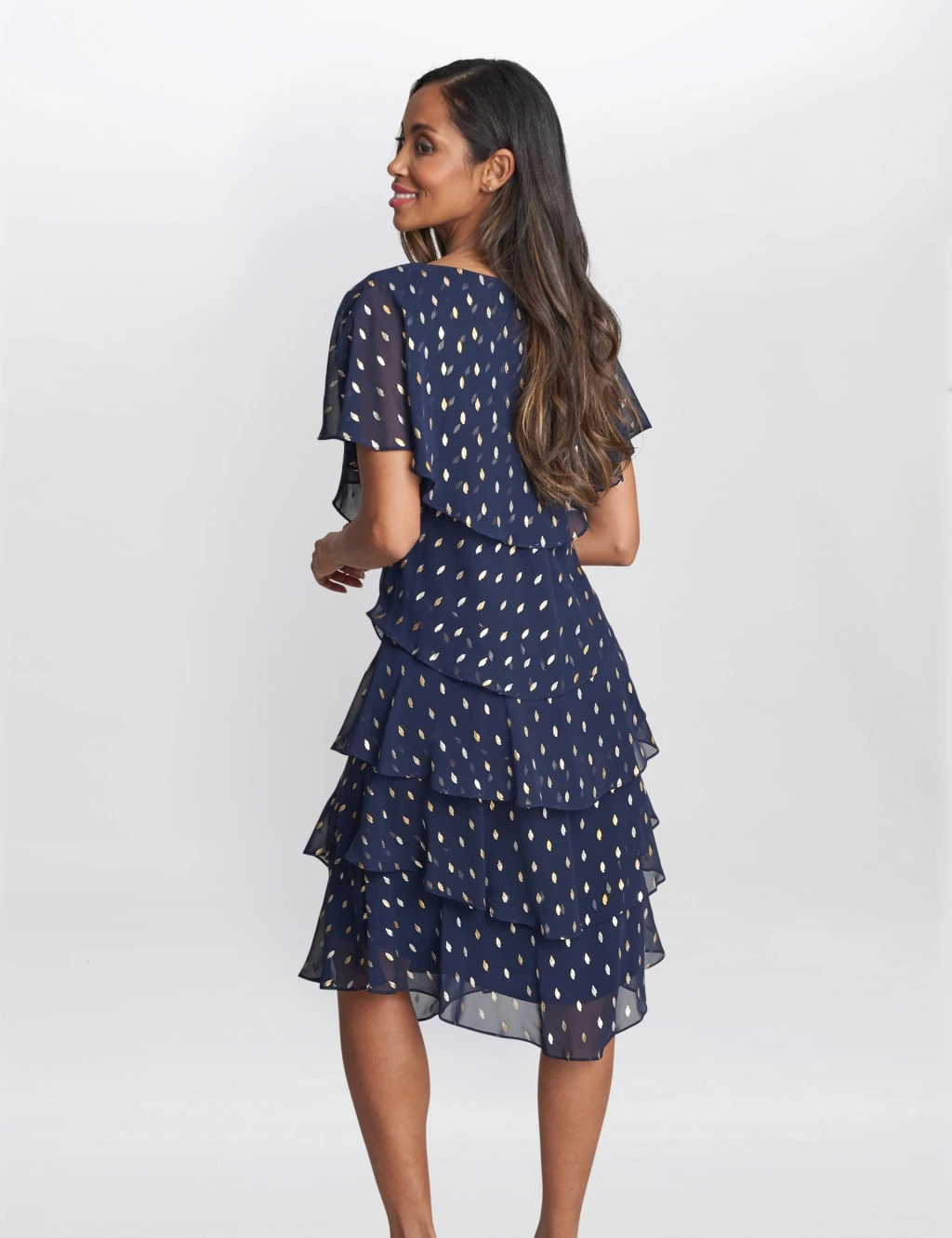 Channel refined elegance in this floaty chiffon dress by Gina Bacconi. It’s cut in a regular fit with a flattering v-neck, highlighted by a floral diamante brooch at the centre. Cape-style short sleeves and a knee-length tiered skirt bring elegant movement. A delicate directional foil pattern adds an elevated finish to the semi-sheer, lightweight fabric.