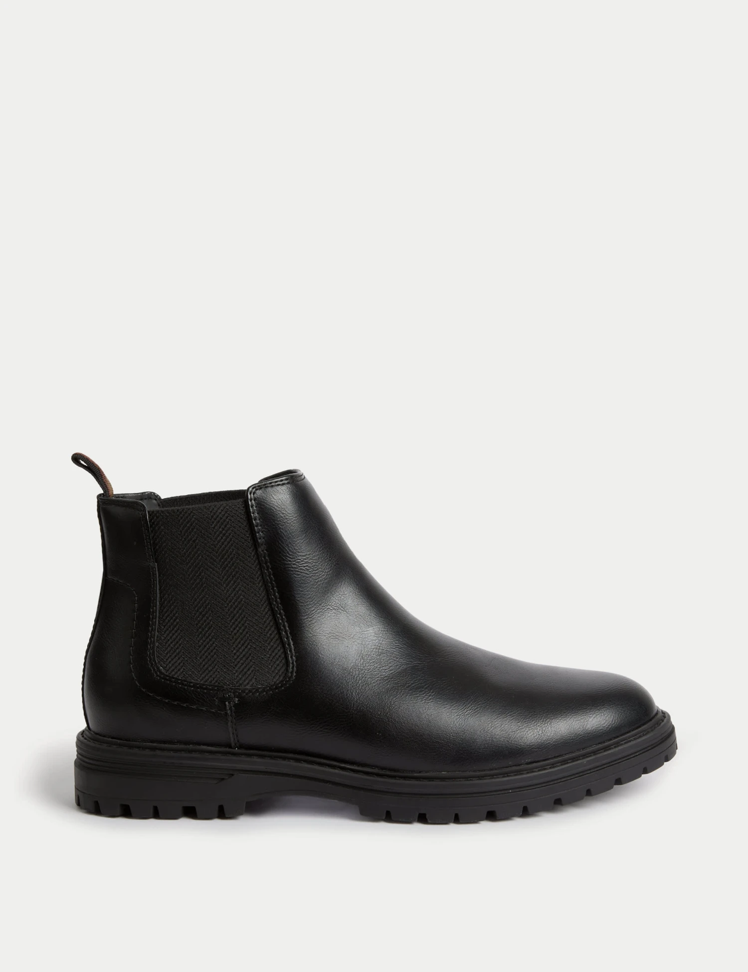 These Chelsea boots are made from vegan-friendly materials. They have a chunky cleated sole for a contemporary look. An elasticated gusset and a heel tab make for easy on-off. Our Freshfeet™ technology fights the bacteria that causes odours to keep your feet feeling fresh. M&S Collection: easy-to-wear wardrobe staples that combine classic and contemporary styles.
