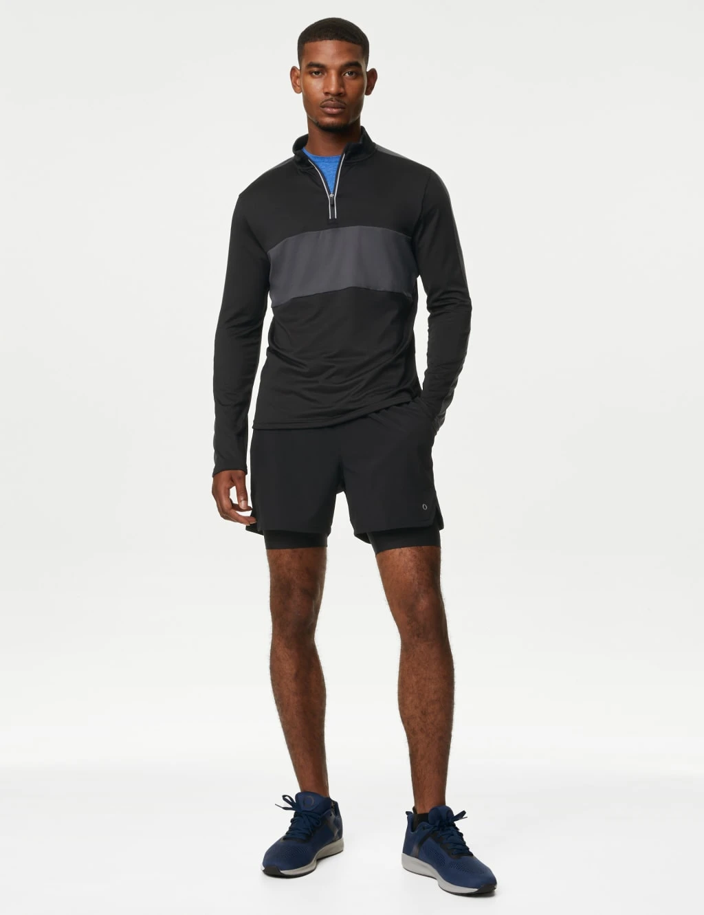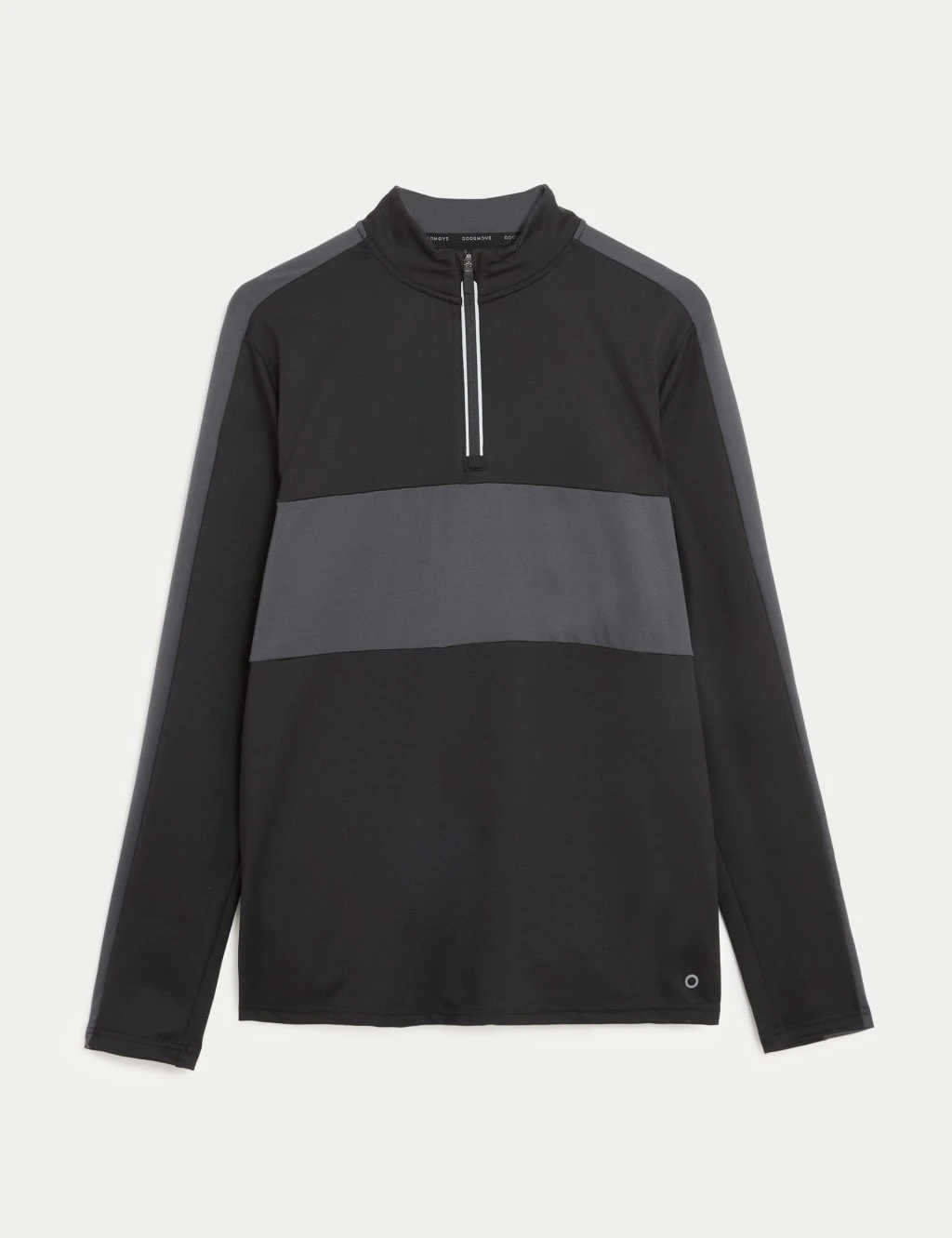 Bring a bold look to your activewear with this colour block top from the Goodmove collection. It’s cut to a regular fit and features added stretch for extra comfort. The long-sleeved design has a funnel neck and a half-zip closure so you can stay cosy while you’re on the move. Moisture-wicking, quick-drying and breathable fabric helps to keep you cool and dry.