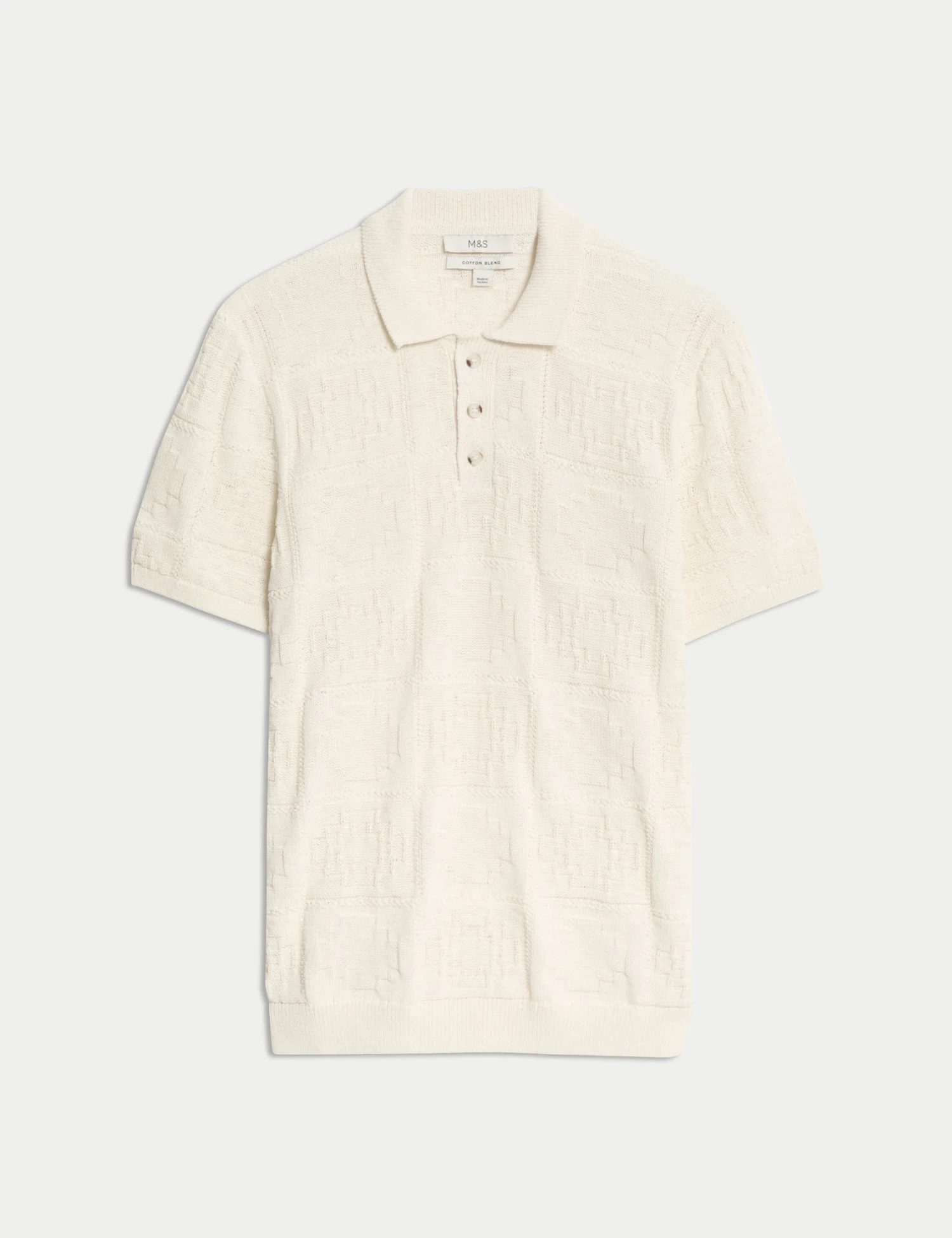 With crochet knit, this cotton-blend polo shirt will make a stylish addition to your smart-casual wardrobe. The button fastening at the collared neckline adds a neat touch. The textured pattern provides a refined finish. M&S Collection: easy-to-wear wardrobe staples that combine classic and contemporary styles.