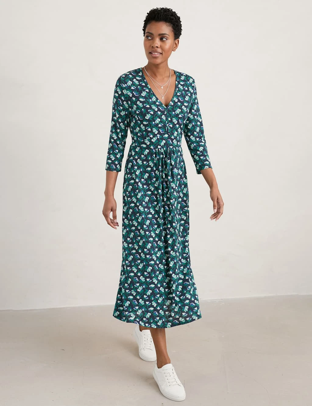 This Seasalt Cornwall dress is made from a soft cotton-blend jersey with a lively floral print. Cut to a regular fit, it gently skims the waist with a tie at the back before flowing into an elegant midi skirt. Flattering three-quarter sleeves and an airy v-neckline make this piece a pleasure to wear.