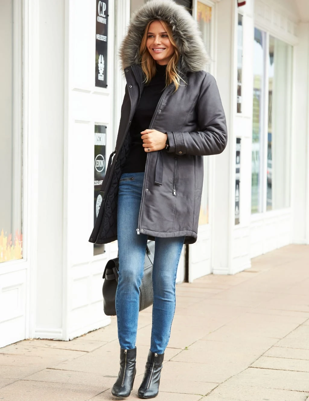 Stay protected from the elements with this stylish cotton-blend parka coat from Sosandar. Designed in a comfortable regular fit, it features a padded and quilted lining for extra warmth. This longline parka includes a popper and zip fastening with a drawstring waist to create a feminine shape. A faux fur trim hood adds a cosy statement finish.