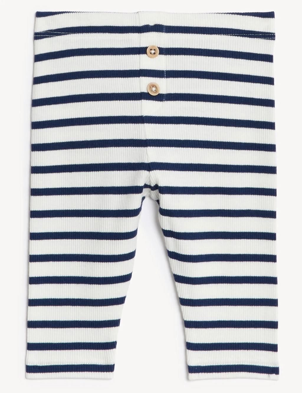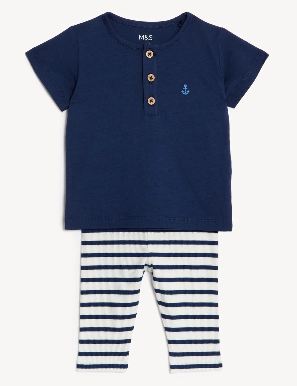 Bring the fun of the seaside to your baby’s wardrobe with this cotton-rich outfit. Two-piece set includes a short-sleeved top with sweet button fastenings and an embroidered anchor on the chest. Paired with striped leggings featuring an elasticated waist to ensure wiggle room.