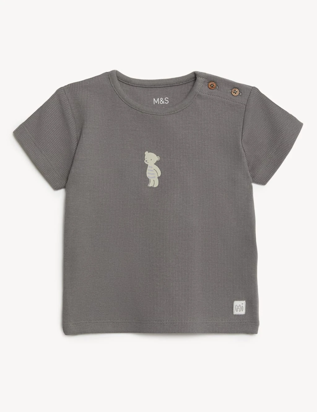 This t-shirt is made from ribbed cotton-rich fabric that feels gentle on delicate skin. Short-sleeved style, with buttons at the shoulder for easy dressing and added stretch for comfort. The sweet bear motif is complemented by a stitched label at the hem reading ‘Hi’.