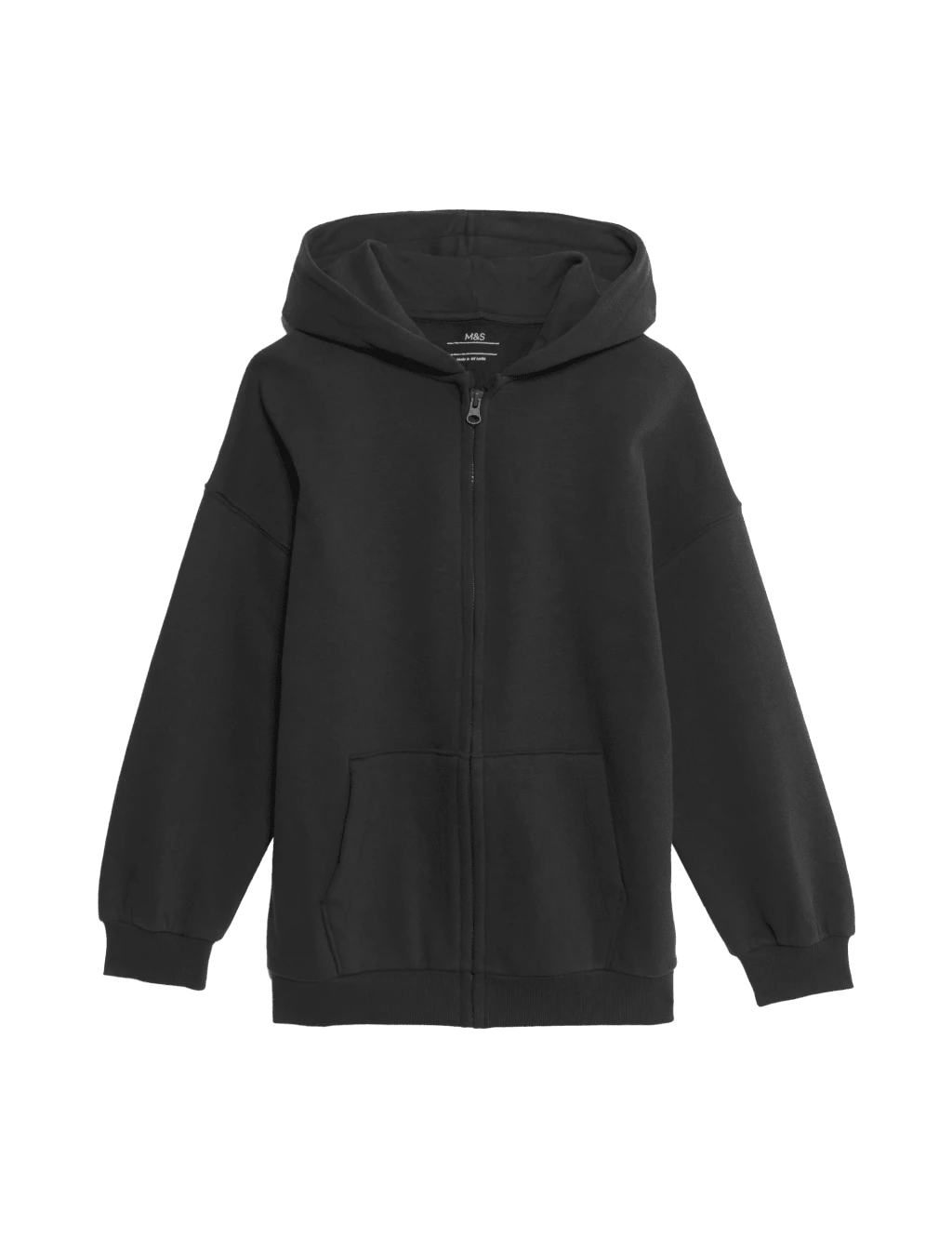This versatile cotton-rich hoodie is an easy choice for relaxed days. Oversized fit with dropped shoulders and a zip-up front for easy wear. A split kangaroo pocket is ideal for keeping hands warm.