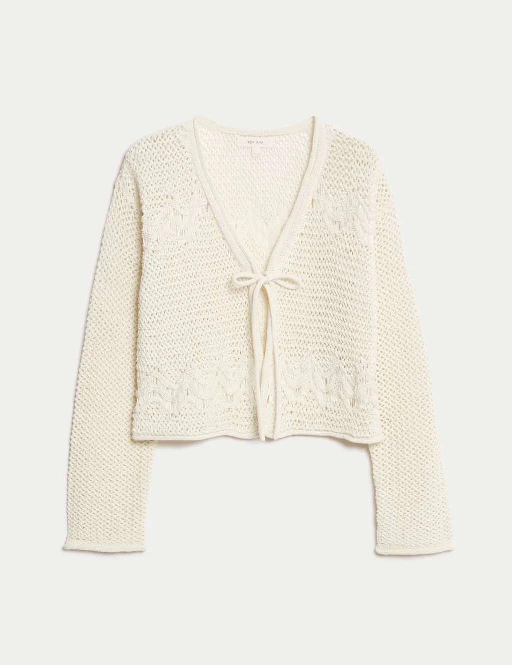 This cotton-rich cardigan from our Per Una collection is knitted in a pointelle stitch for a delicate look. It’s designed in a relaxed fit and features an open front with a tie fastening at the v-neckline. Ribbed trims at the cuffs and hem add a neat finish. Per Una: stylish designs crafted with carefully considered details and feminine flourishes.