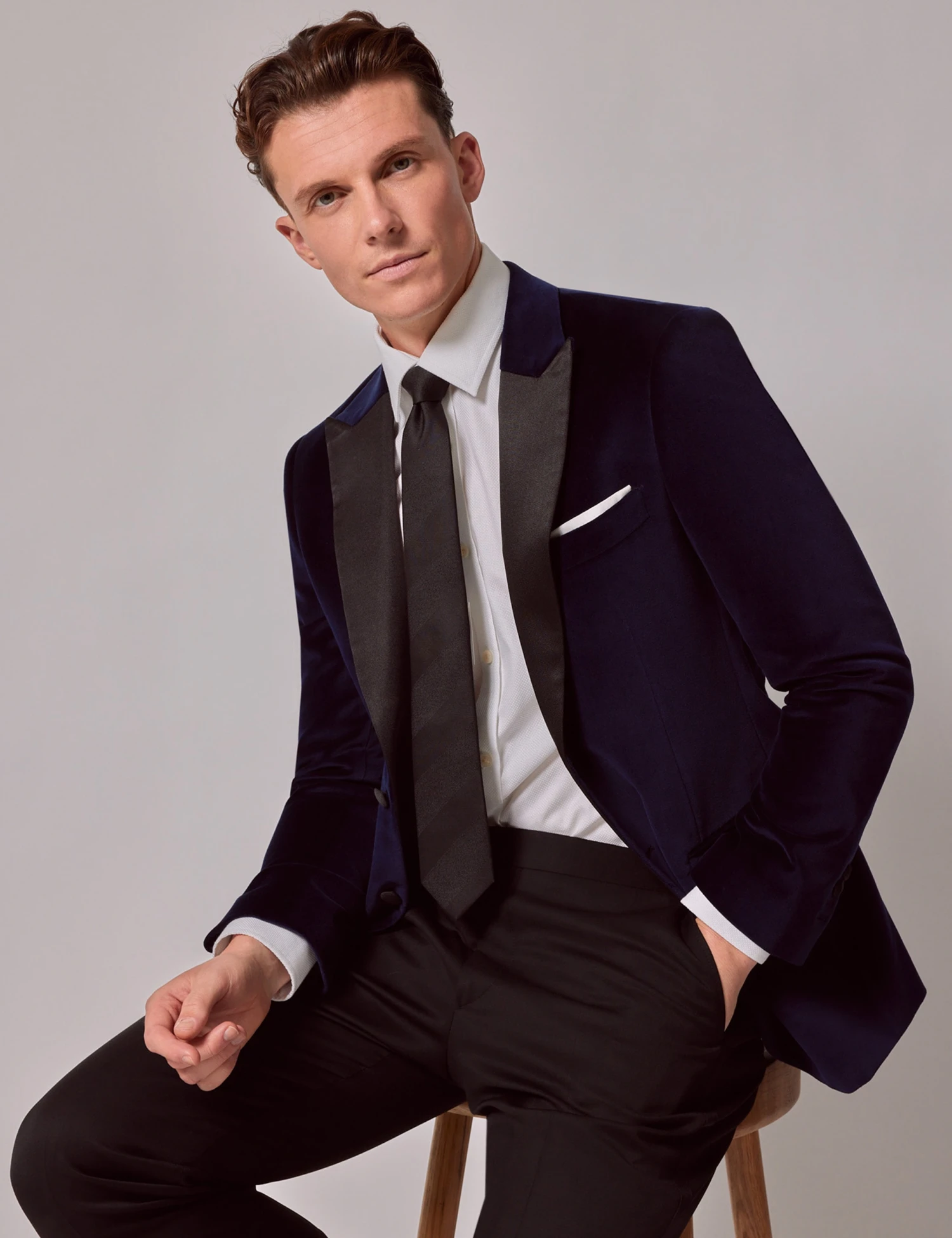 Lend your formal ensembles a luxurious finish with this cotton-rich velvet jacket from Hawes & Curtis. The single-breasted piece is cut to a regular fit, with fabric buttons and sleek peak lapels. Two back vents and a touch of stretch in the fabric ensure you can move comfortably. Pockets inside and out give plenty of space for your essentials.