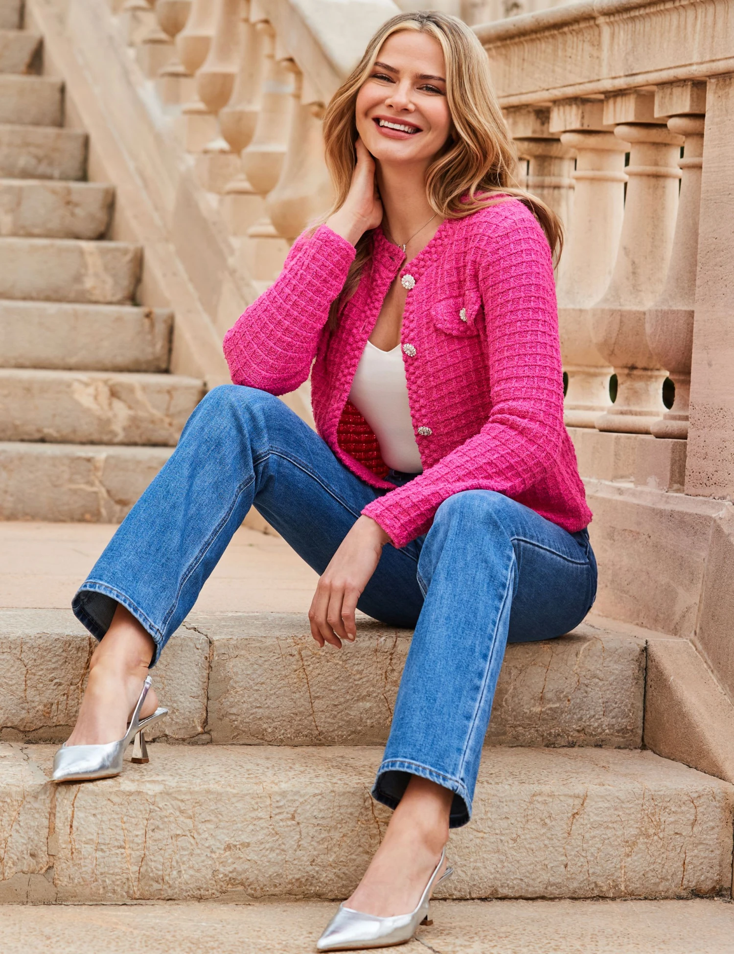 This cardigan by Sosandar is knitted in a textured waffle knit for a luxe feel. It’s made in a chic boxy fit, with a neat crew neckline, chest pockets and long sleeves. Sparkly floral diamante buttons add an extra touch of glamour.