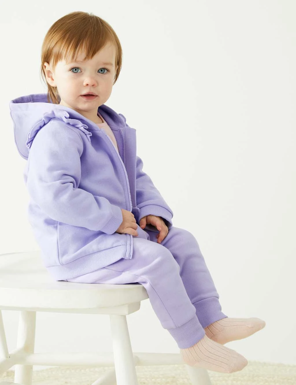Little ones will be stylish and cosy in this cotton-rich hoodie. Frills on the shoulders add an extra touch of style, while the handy zip fastening makes it easier to get them ready. We only ever use responsibly sourced cotton for our clothes.