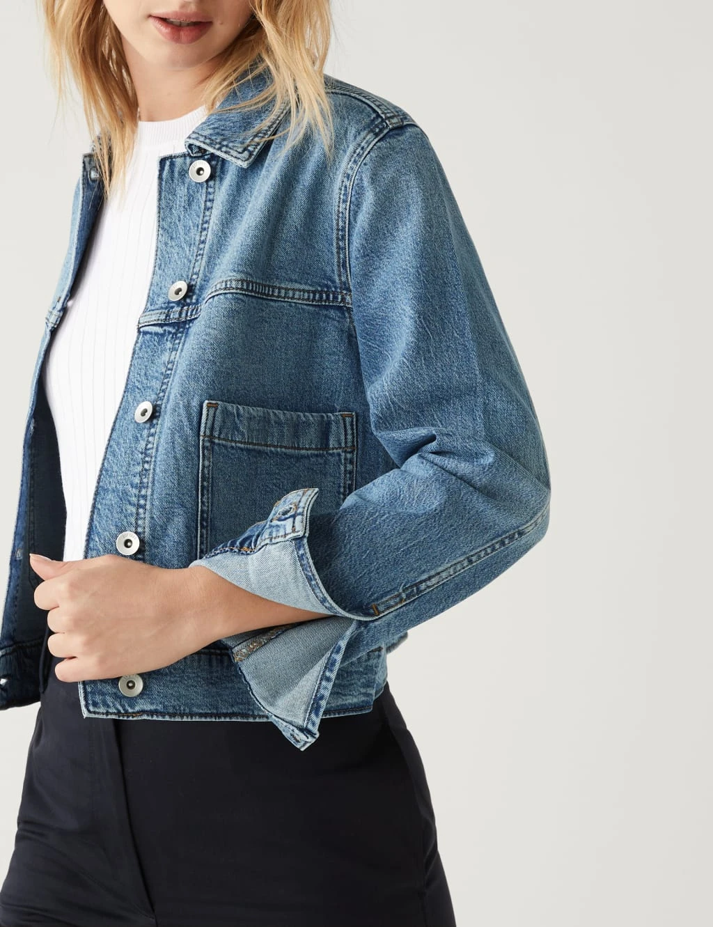 Laid-back plans call for this collared cotton-rich denim jacket, which is perfect for layering over dresses thanks to its cropped length. It’s cut in a regular fit, with added stretch for easy movement. The front features yoke detailing and two utilitarian-style patch pockets for your belongings. Silver buttons and a casual wash give an authentic look. It’s also available in another timeless colour.