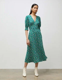This vintage-inspired tea dress from Finery London has an exclusive print of delicate flowers. This regular-fit piece has an elegant bias cut and a versatile midi length. Its three-quarter sleeves are slightly full, finishing in shirred frills. A v-neckline adds a touch of subtle glamour to the dress. Made with responsibly sourced viscose.