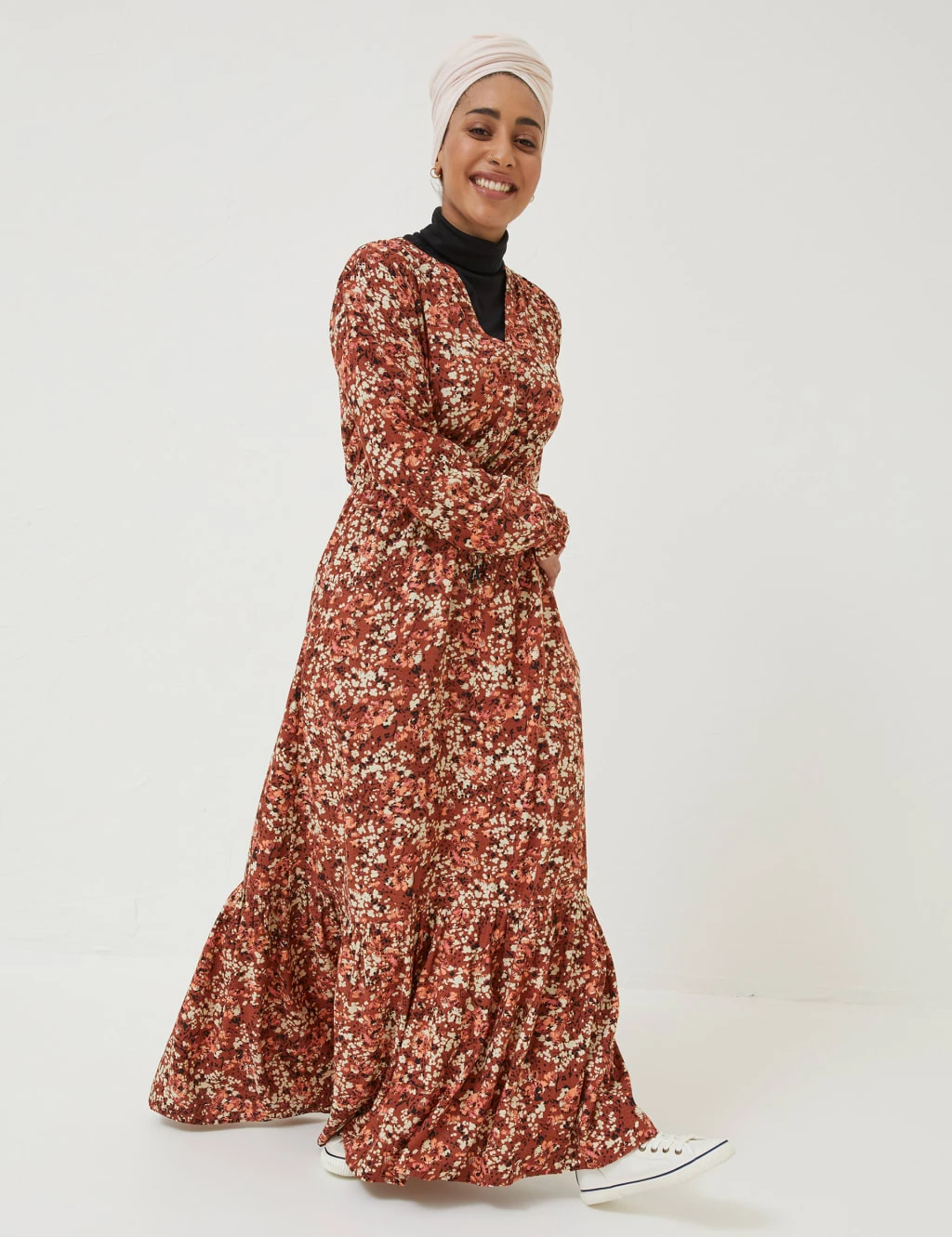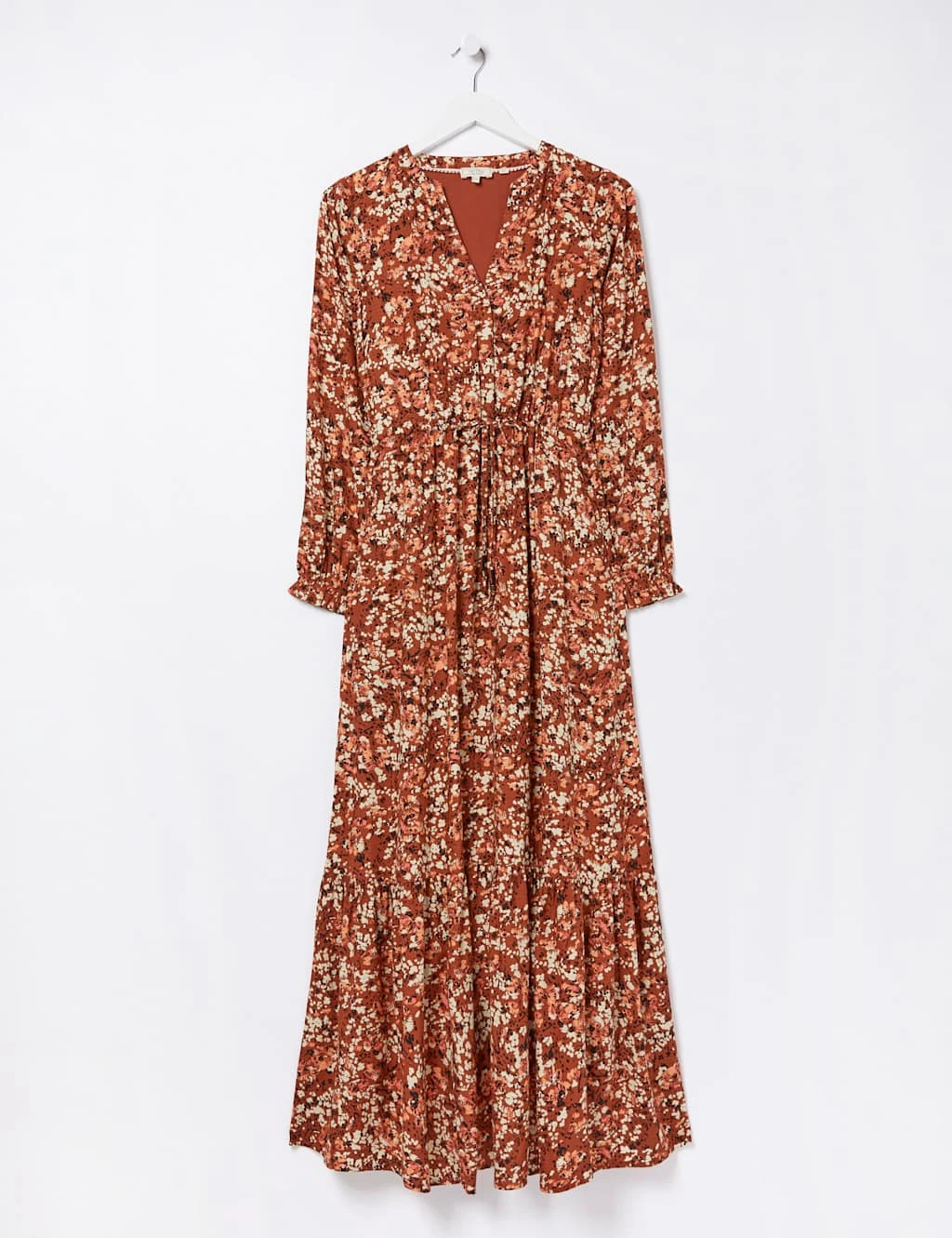 This tiered floral FatFace dress is fun to the maxi. The regular-fitting piece has an ankle-length skirt with a deep frill, complemented by smaller ones at the cuffs. An elasticated waist with an integral tie belt gives definition to your shape. The front button fastening runs from the v-neck to the waist, with the buttons discreetly covered by a concealed placket.