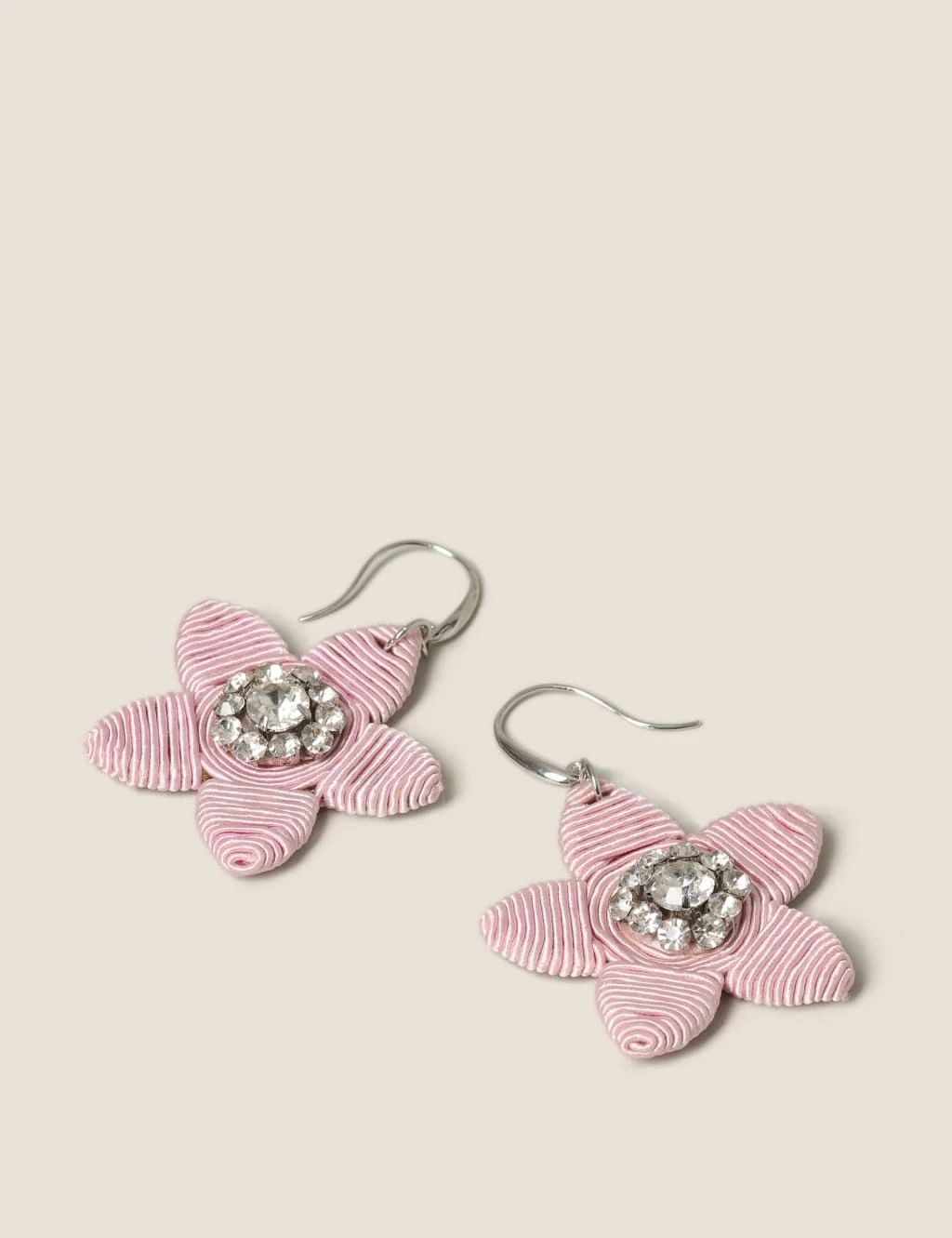 These pink fabric wrapped earrings sit in the shape of a traditional flower. This is finished of with a silver faux stone centre of small entrusted stones on a fish hook style earring.