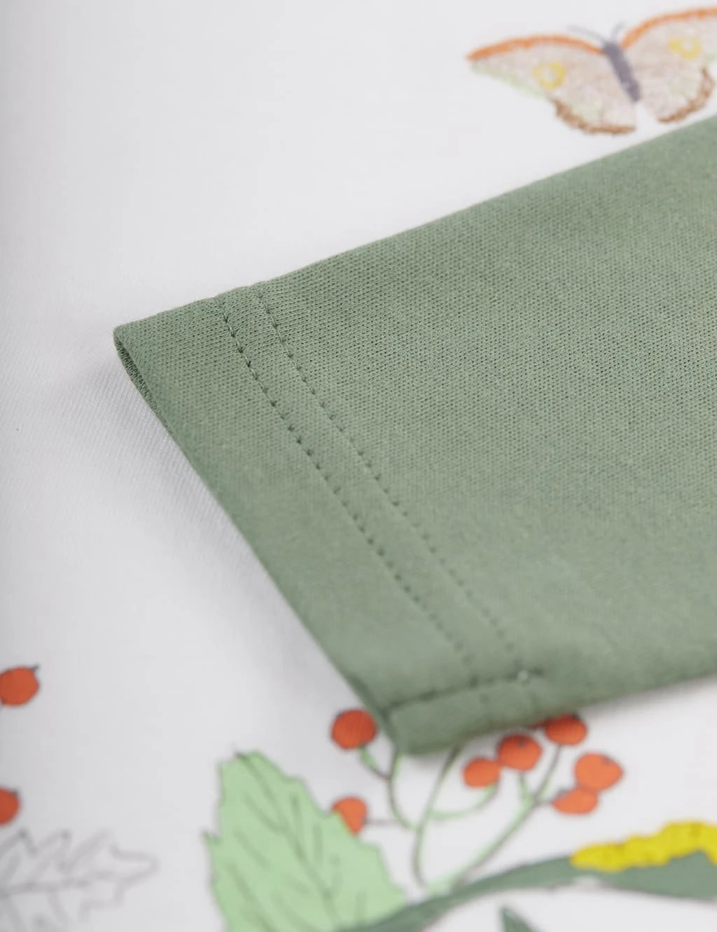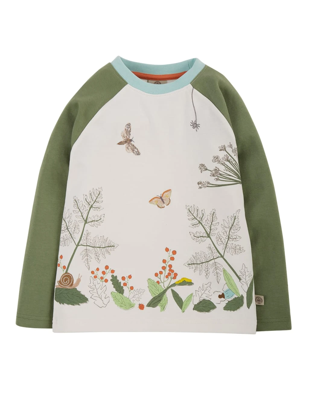When the great outdoors calls, this organic cotton Frugi t-shirt is ideal for exploring in. It’s cut to a regular fit, with long raglan sleeves in a contrasting colour for a laid-back effect. The front is printed with foliage and insects, with embroidered detailing for a charming finish.