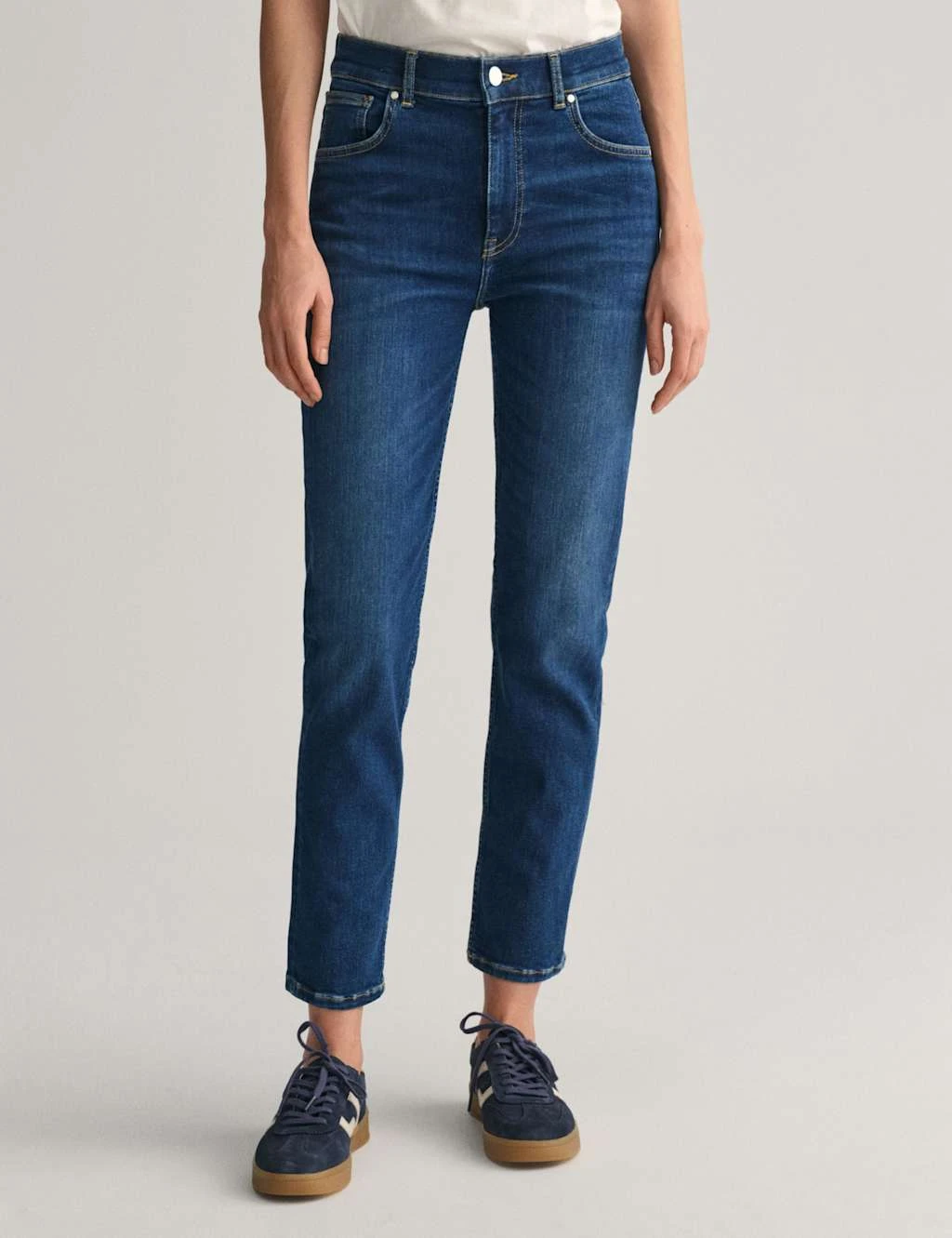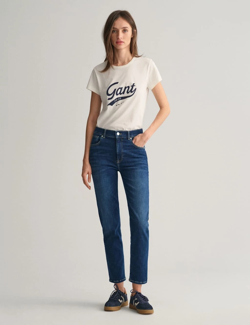 Elevate your denim collection with these stylish jeans from GANT. Designed in a slim fit, they sit comfortably at a flattering mid-rise and feature an on-trend cropped leg. Crafted from cotton-rich denim with added stretch, they offer a soft feel, while classic details like a button-and-zip fastening, five-pocket styling and a branded leather patch complete the look.