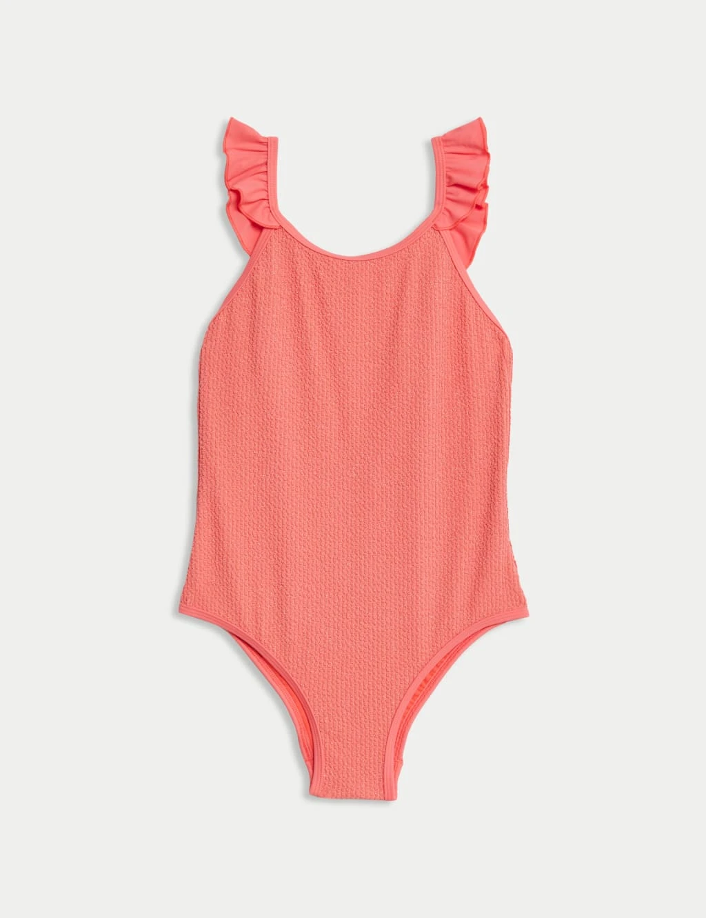 This textured swimsuit’s all-over glitter finish will make them shine out at the pool or beach. Comfy regular fit for easy wear. Added on the smooth fabric stretch allows freedom of movement. Lining ensure extra comfort. Frills on the straps for a pretty finishing touch.