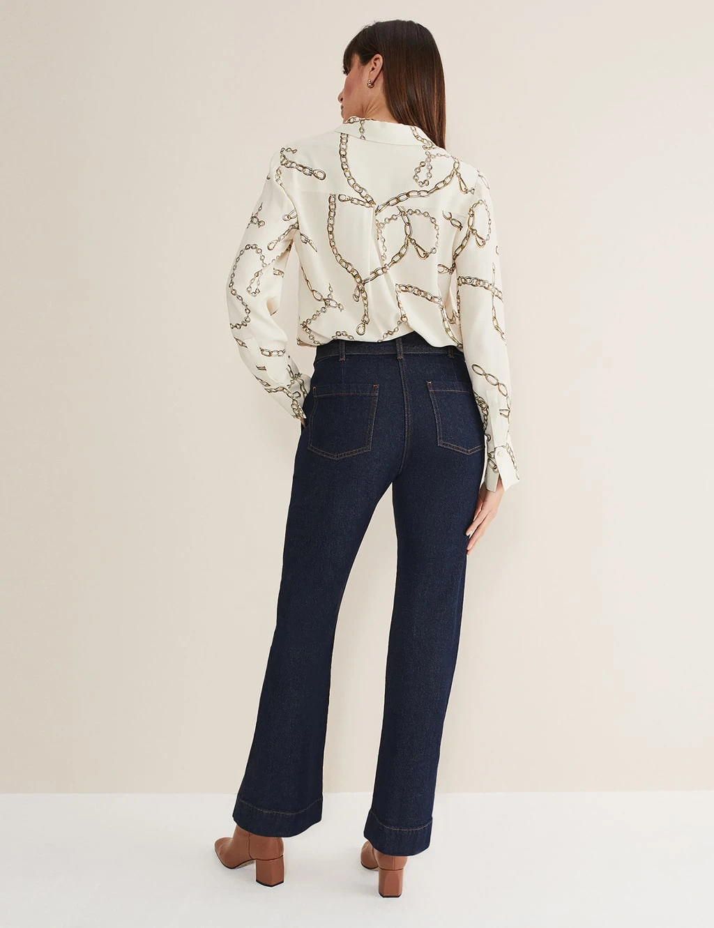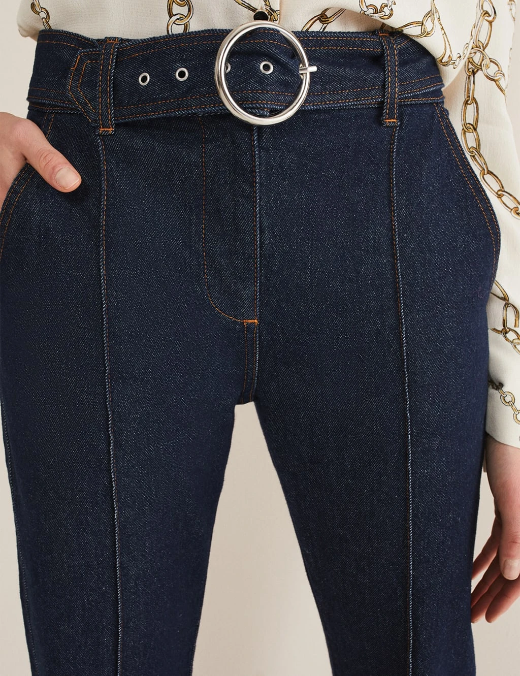 Elevate your casualwear with these crisply styled denim jeans from Phase Eight. They’re cut to a statement flared silhouette, with a neat button and zip fastening at the flattering high waistline. Exposed seams down the front of the legs create a smart look, while a gleaming ring buckle gives extra standout detail to the matching belt. Side pockets at the hips and patch pockets on the back provide useful storage.
