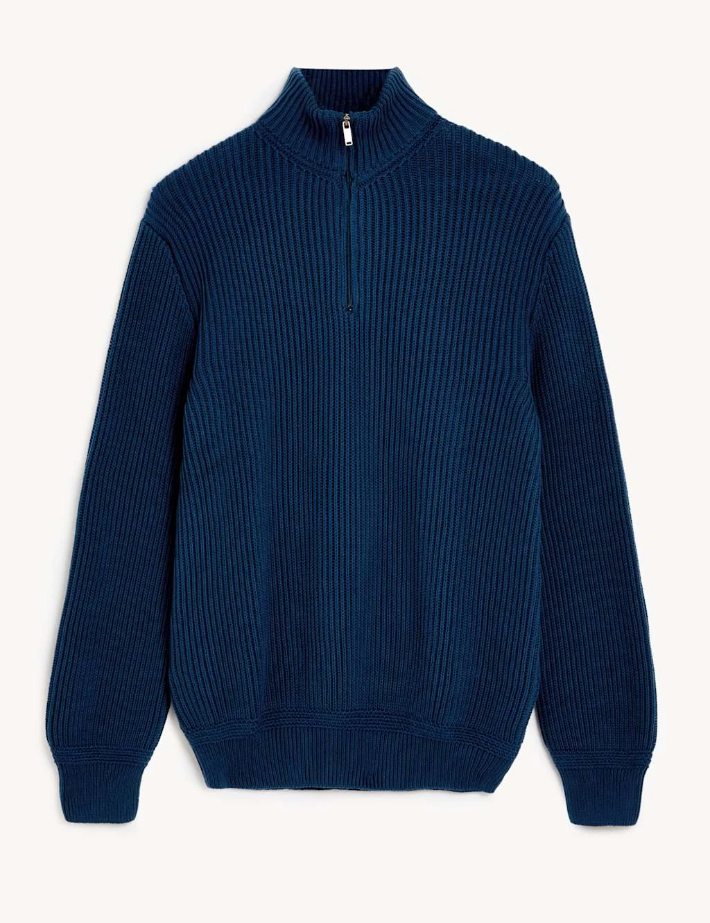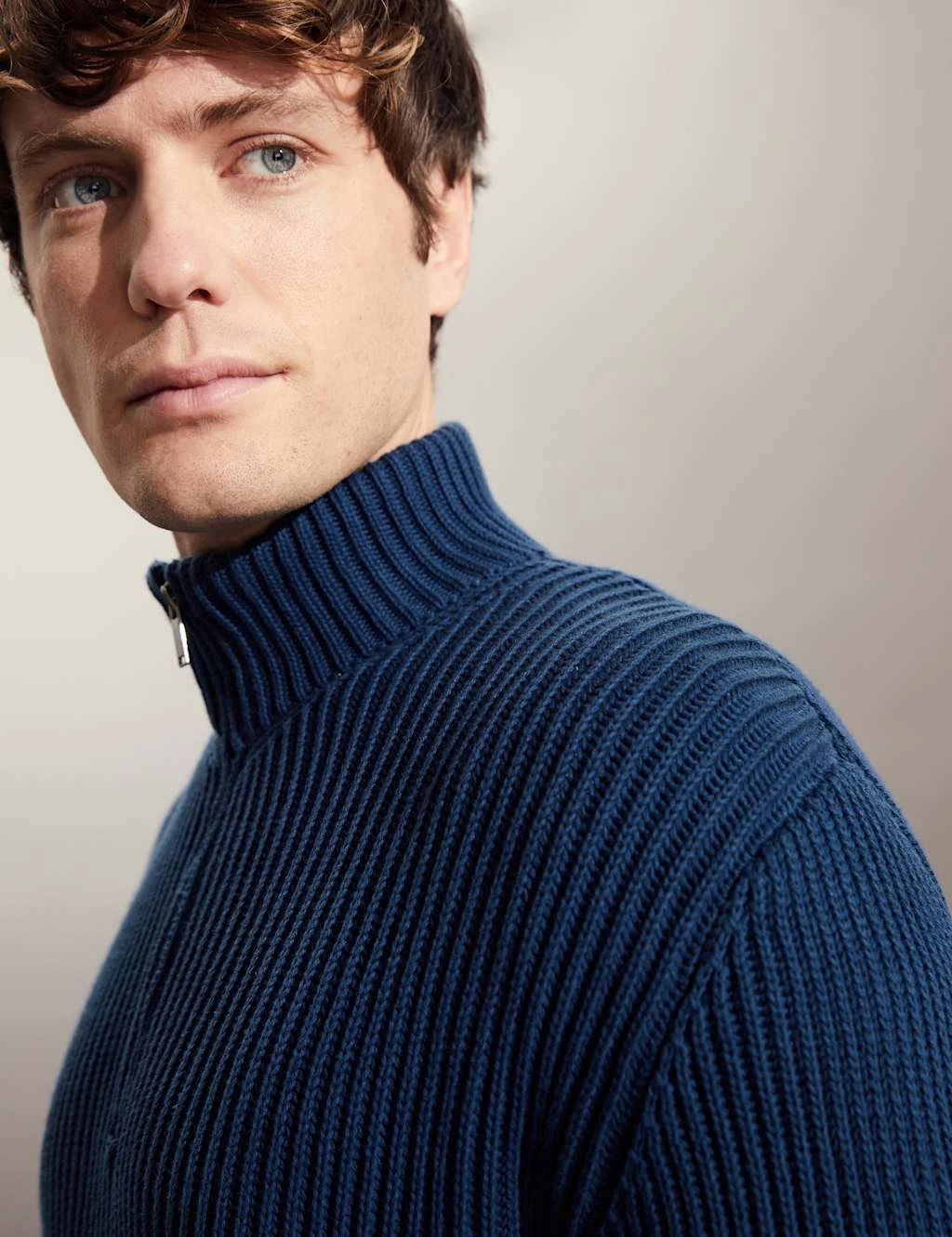This Jaeger jumper is luxuriously thick and weighty, with a 7-gauge pure cotton construction knitted at Italy’s renowned Filidea mill. Ideal for layering, it has a comfy regular fit and a ribbed texture that gives the fabric extra stretch. A zipped funnel neckline and ribbed trims deliver a snug feel. It’s complete with a Jaeger-branded metal zip. Team yours with dark denim and desert boots for a refined take on off-duty dressing.