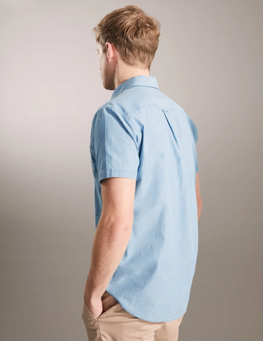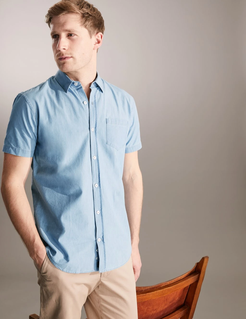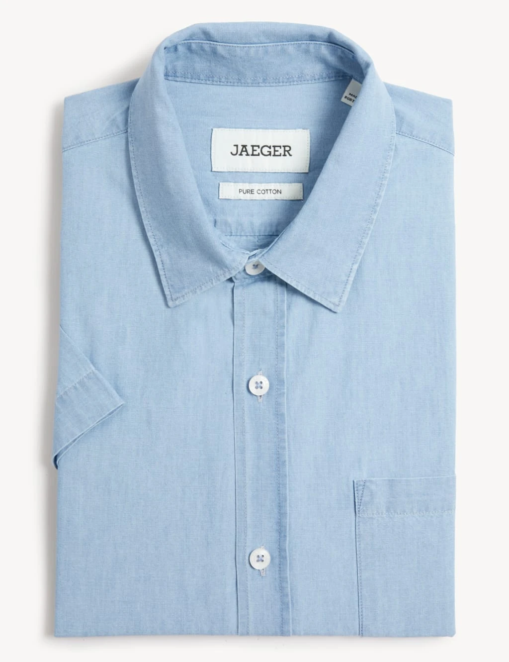 With its pure cotton chambray fabric, this Jaeger shirt hits the sweet spot between smart and casual. It’s classically tailored with a regular fit, collared neckline and buttons through the front. Short sleeves add to its breezy feel. Keep yours laid-back with neutral chinos and lace-up trainers.