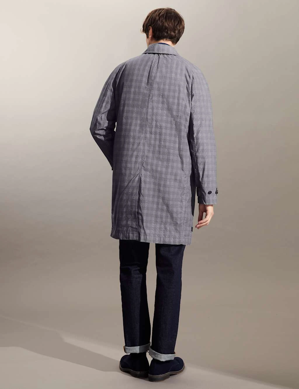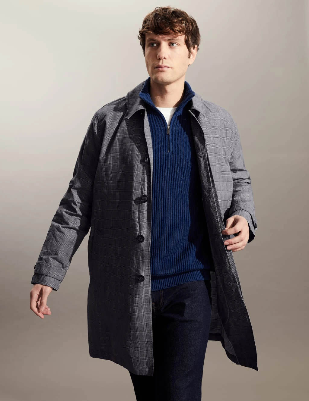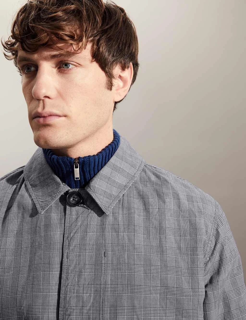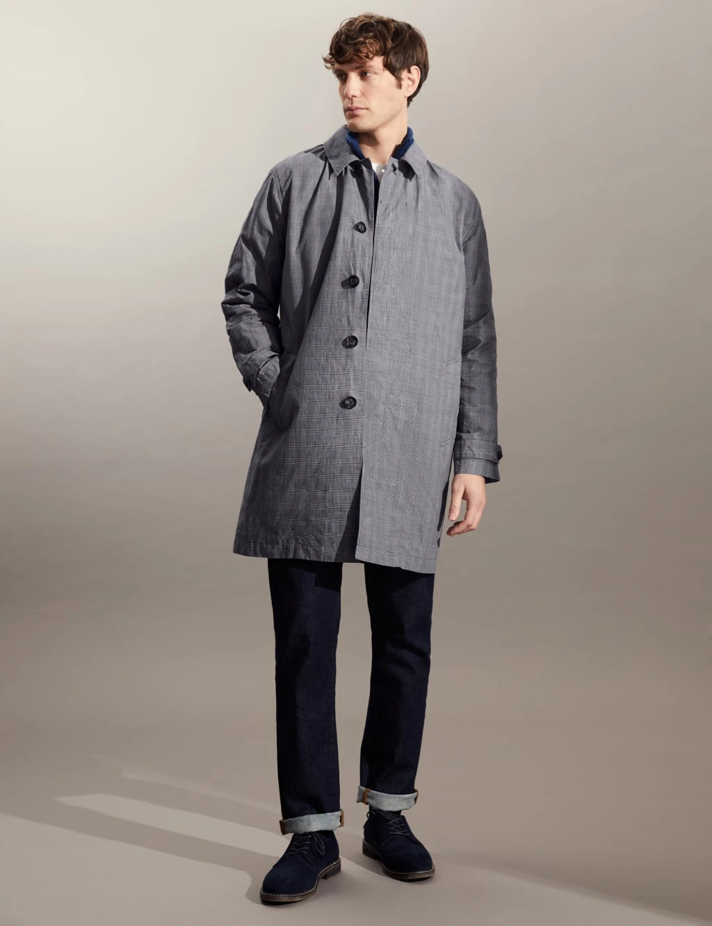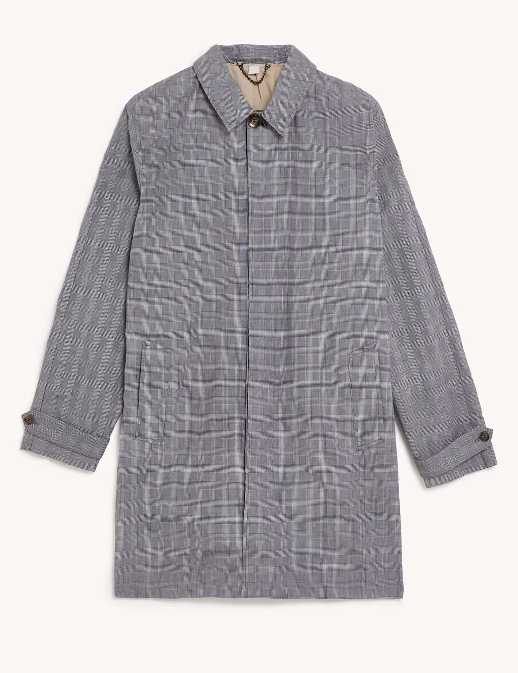 This smart trench coat by Jaeger is crafted from waxed cotton cloth with a distinctive check print. It’s lightweight and water-resistant, thanks to the superior fabric from Scottish mill Halley Stevensons. Traditional trench features include bands at the cuffs, a neat collar with a corduroy undercollar and two front pockets. The coat is also part-lined and has fully bound seams for comfort, while the vent ensures movement is easy. Wear it as a smart extra layer on a chilly day.