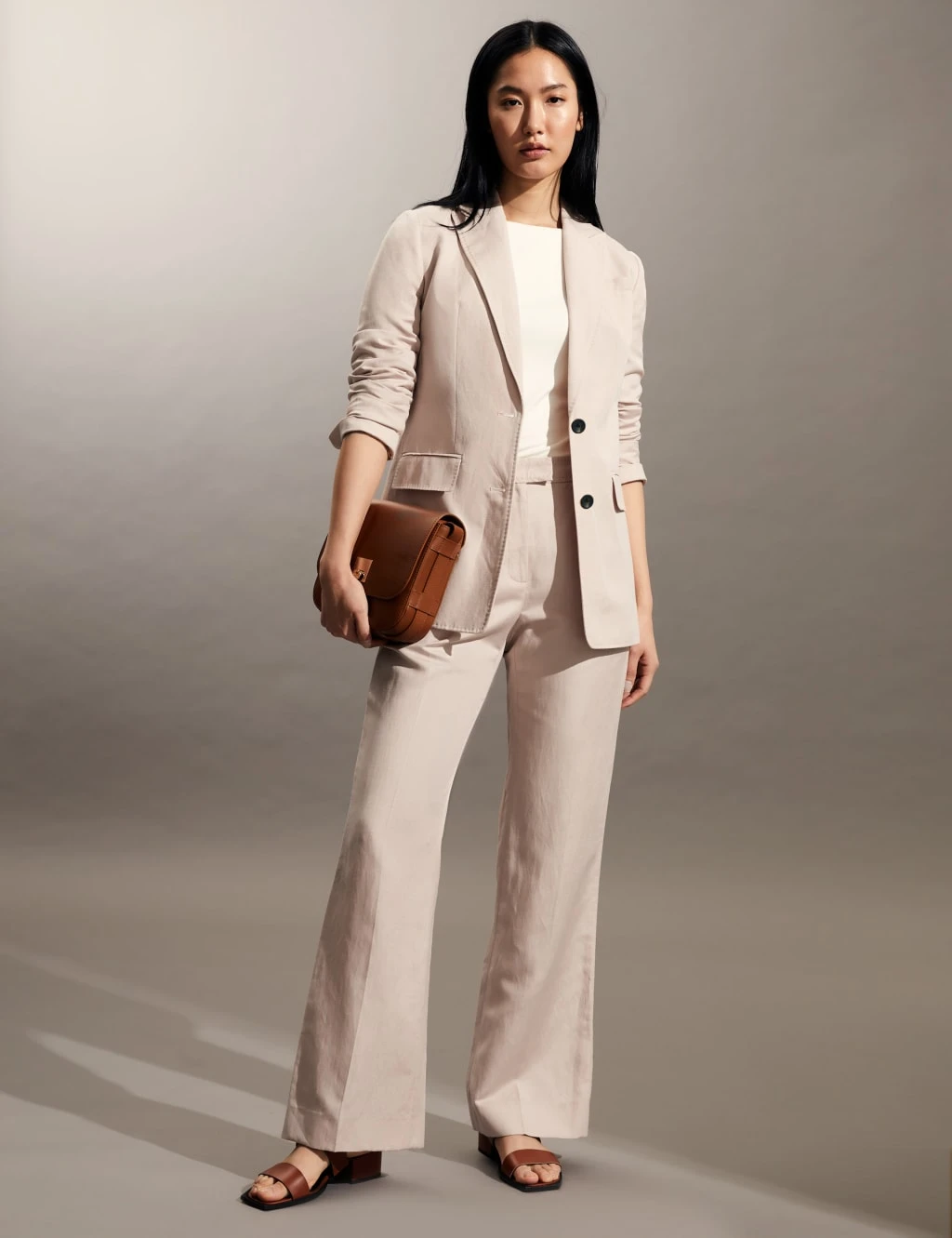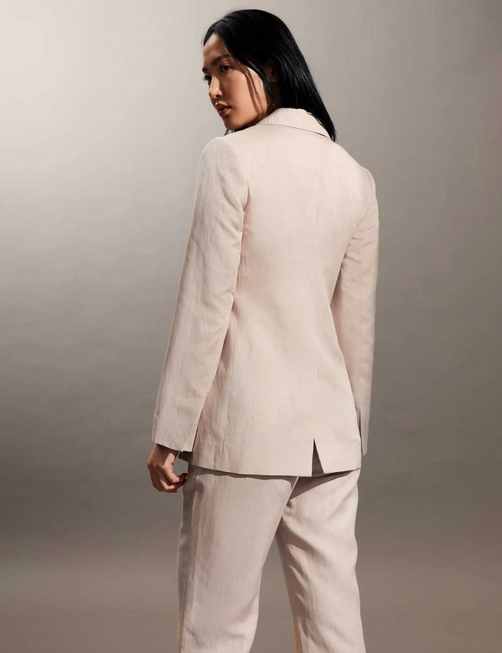 A silk and linen fabric gives this Jaeger blazer a truly luxurious quality. It’s cut to a regular fit with soft shaping through the waist. The single breasted front delivers a classic look. Traditional details include peaked lapels, flap pockets and a back vent. Team yours with the matching trousers, a white tee and sandals for a summery take on tailoring.