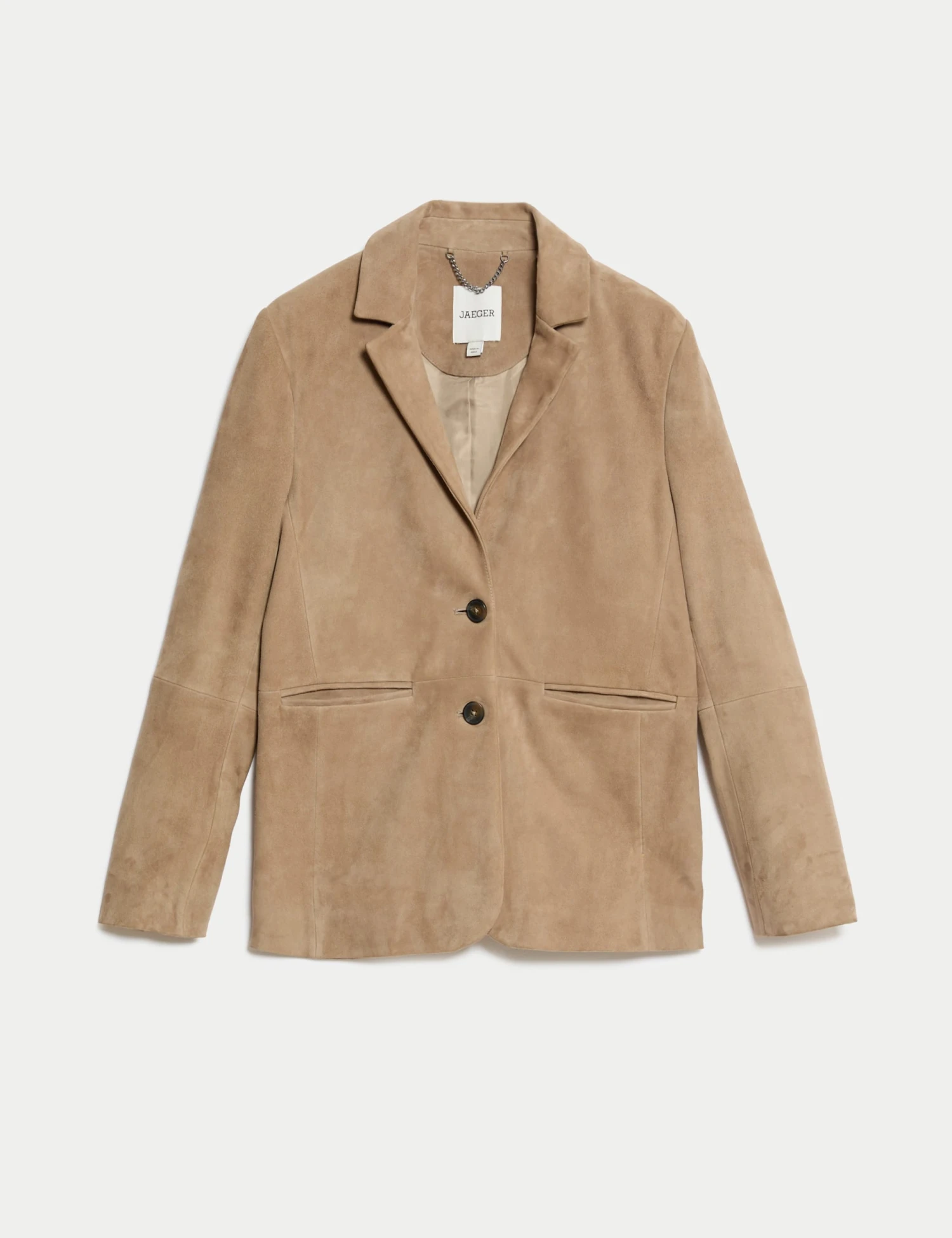 Sumptuously soft suede makes this Jaeger blazer a luxurious layering piece. It’s cut in a regular fit for a comfy feel and features a deep yoke panel across the back for extra shaping. The notched collar and double jet pockets at the waist create a classic look. Branded buttons at the front, plus functioning buttons at the turn-up cuffs, give refined detail.