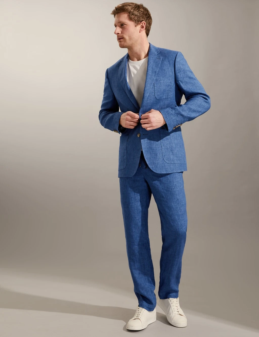 Smart tailoring meets easy versatility with these Jaeger trousers. They’re cut to a classic tailored fit, from pure linen chambray cloth that’s sourced from Italy’s Leomaster mill. Single pleats through the front add drape and movement. There’s a zip and button fastening, along with a drawcord and an elasticated waistband at the back to give an adjustable fit. Back welt pockets deliver a neat finish. These trousers are lined for comfort. Match yours with the co-ordinating jacket and a white t-shirt for a relaxed approach to suiting.