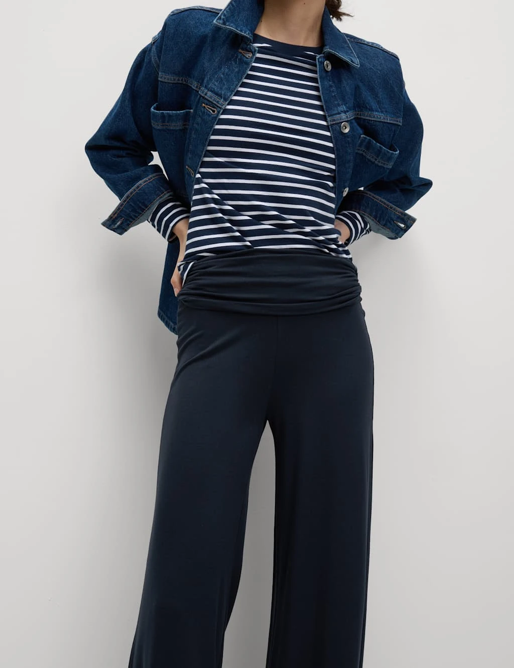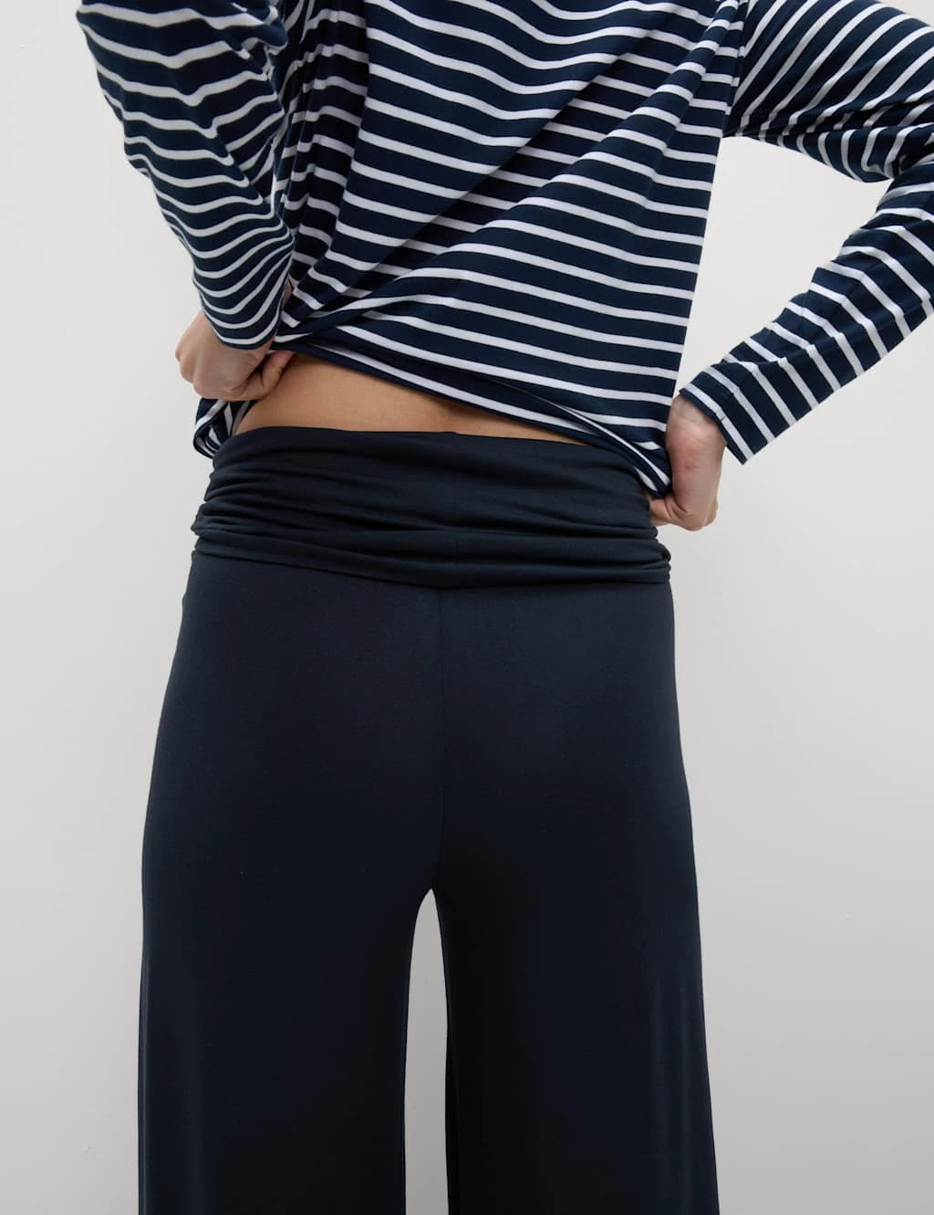 These jersey trousers are an easy choice for casual days. They have a wide leg shape and a mid-rise fold-over waistband. Made with a touch of stretch for comfort. M&S Collection: easy-to-wear wardrobe staples that combine classic and contemporary styles.