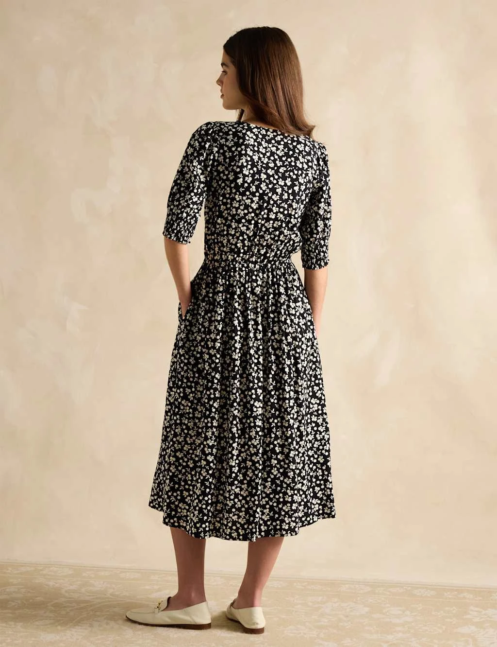 With its versatile floral print, this waisted dress by Joules can be dressed up or down. It has a comfy regular fit, with a feminine v-neckline. A shirred waist and buttons on the bodice add a smart touch to this short-sleeved midi. It’s finished with side pockets.