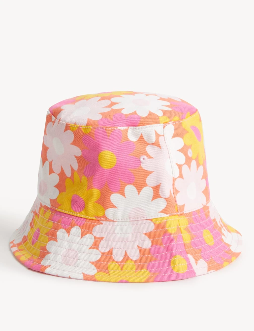 Kids will love this protective pure cotton sun hat. Its bold floral print is perfect for summer days and holidays. With an adjustable chin strap for ages up to 18 to 36 months. Our Sun Smart UPF50+ technology is endorsed by the British Skin Foundation and helps to protect against harmful UV rays.