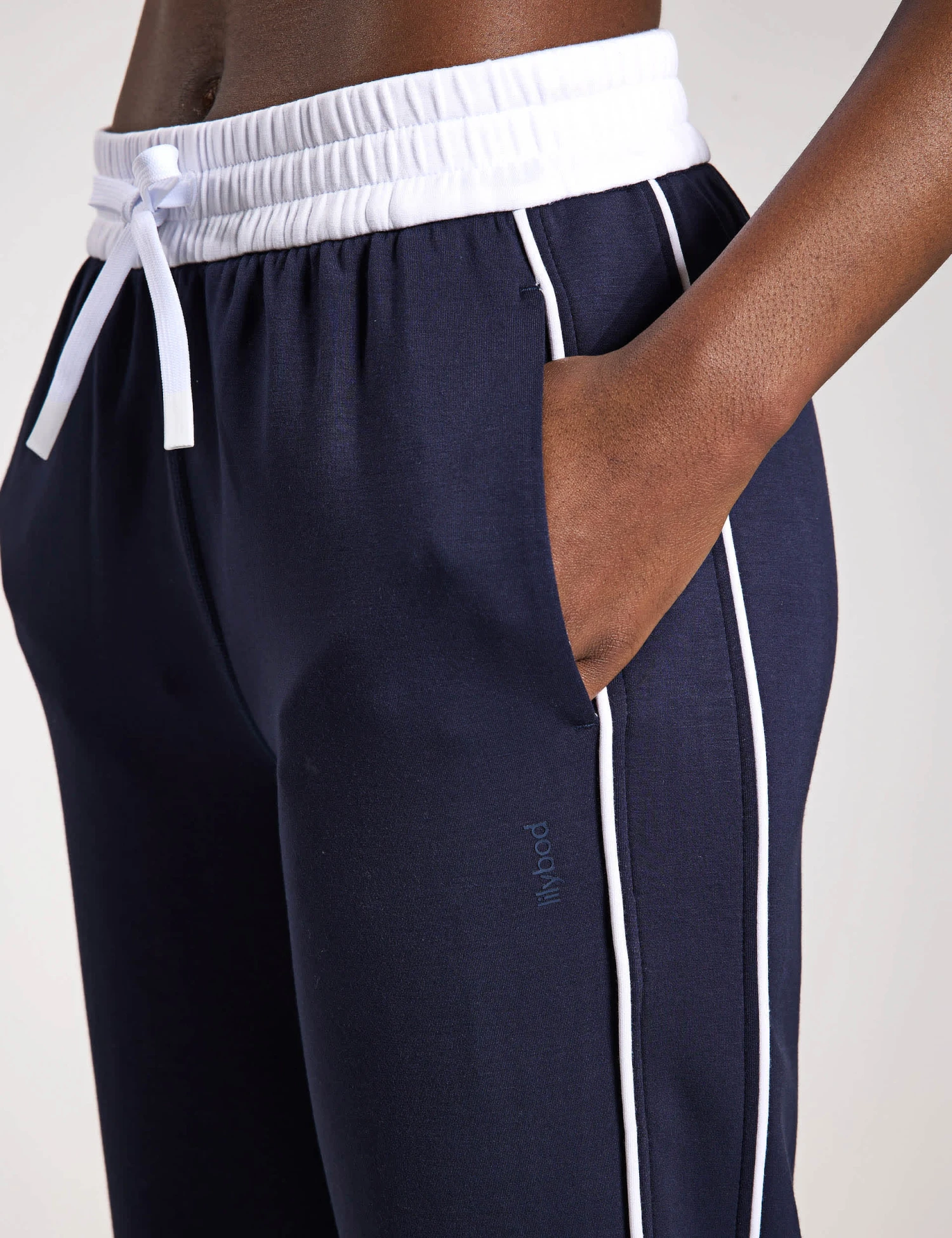 Refresh your activewear wardrobe with the Kirsten joggers from Lilybod. These versatile trousers are made with a stylish wide leg and a flattering high waist. The comfy elasticated waistband has an adjustable drawstring fastening for your perfect fit, in a contrasting colour to match the sporty piping down each leg. Side pockets add the finishing touch.